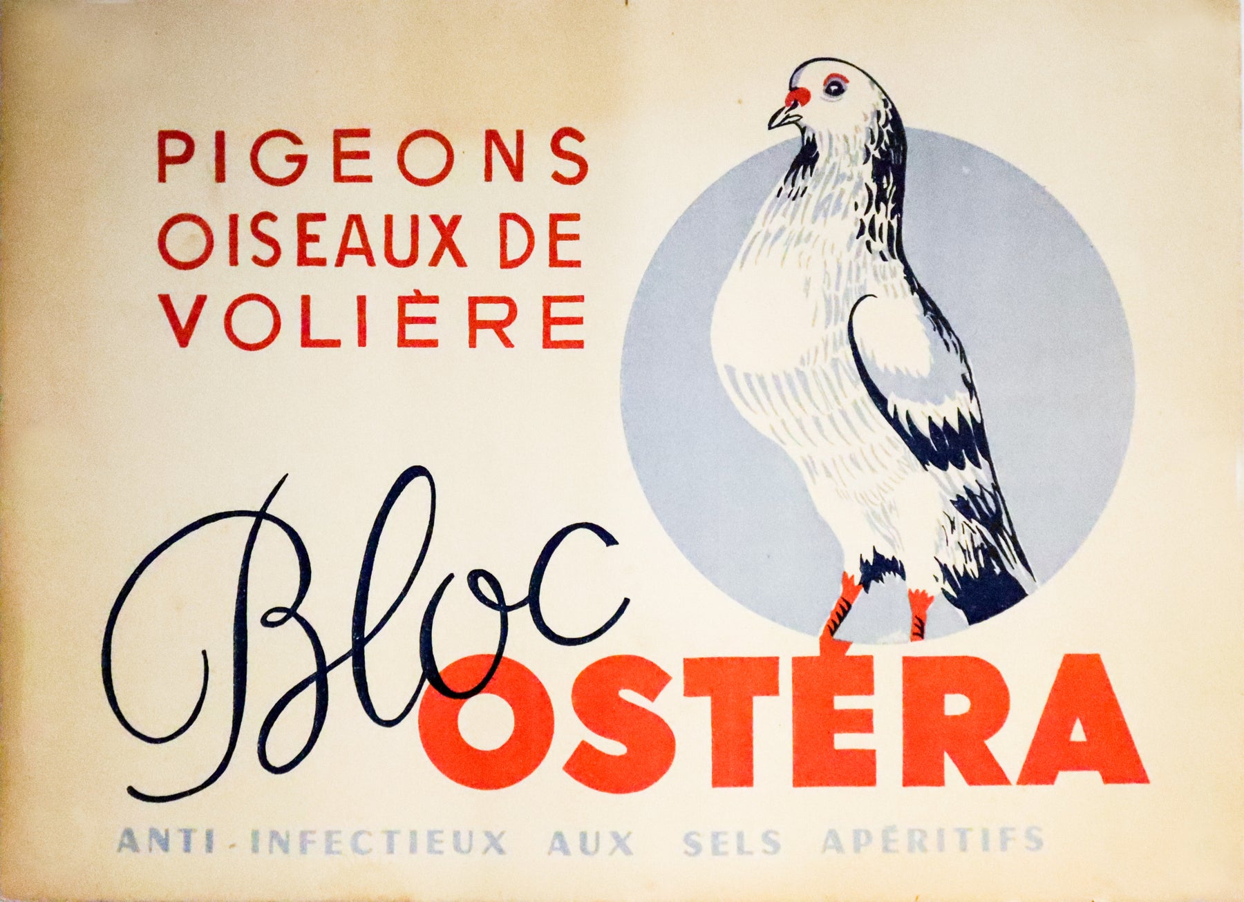 About the poster: This vintage Buvard paper advertised Bloc Ostéra, a salt lick made to supplement animals’ diets with essential minerals like sodium, potassium, and magnesium. Salt licks are blocks which animals lick to support hydration, muscle function, and electrolyte balance, making them vital in animal husbandry to prevent deficiencies and promote health. For pigeons, they aid bone development, feather health, and overall vitality—especially important since grain diets often lack key minerals.
