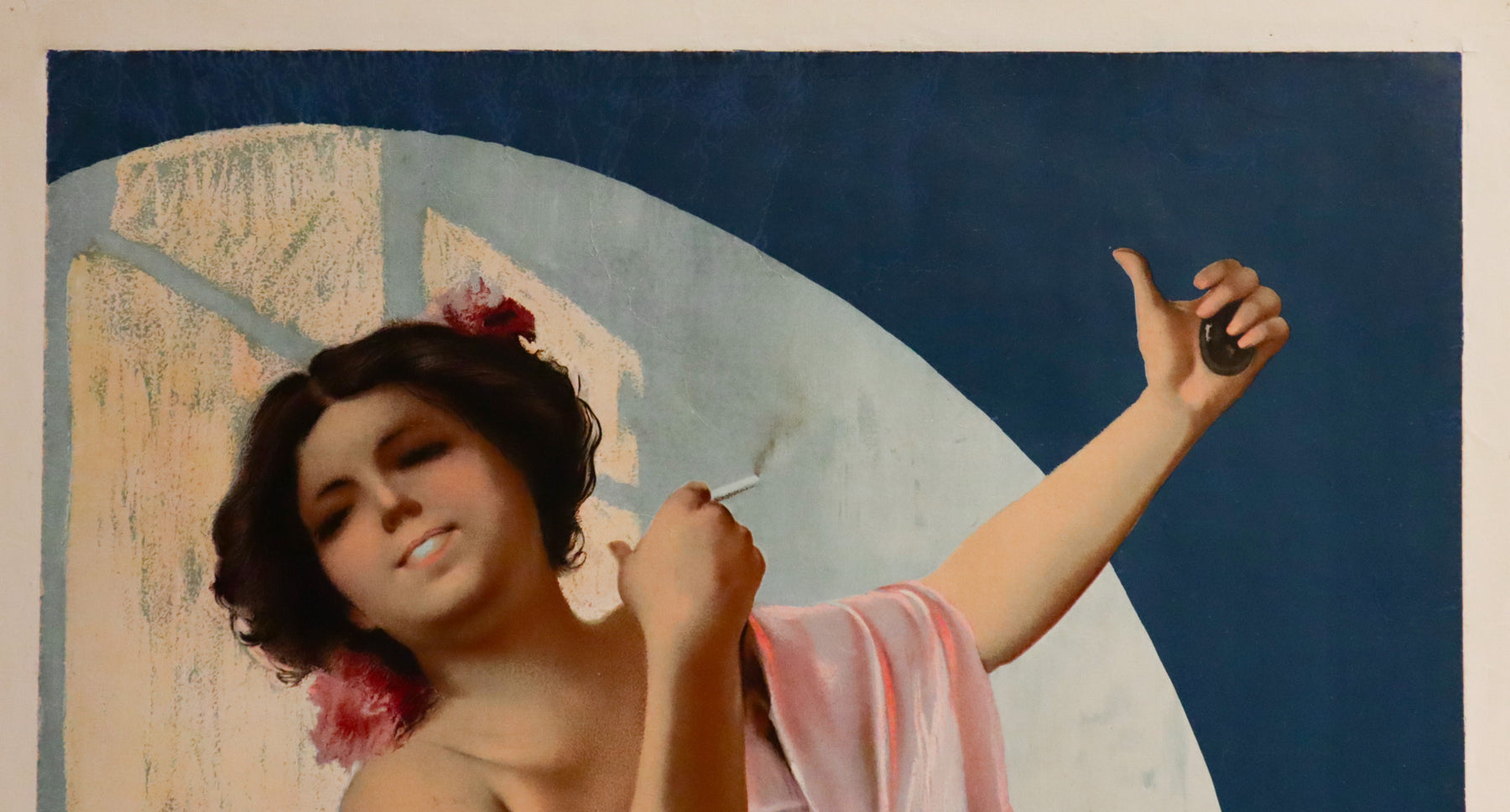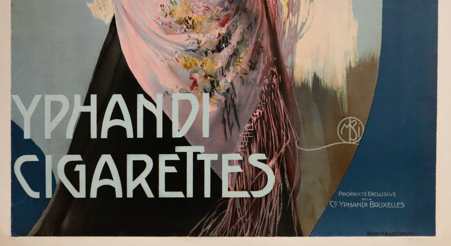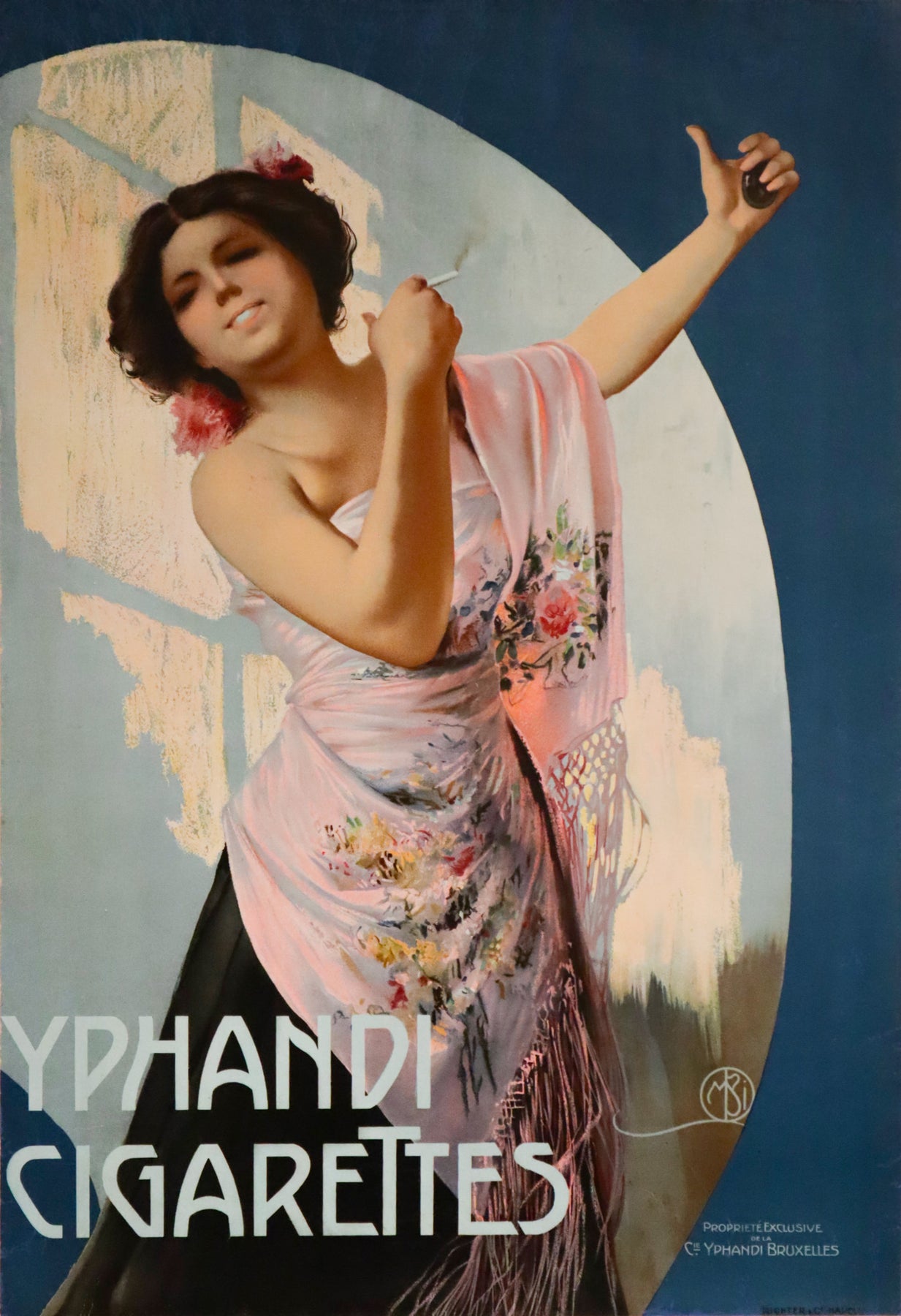 Printed in Belgium for the Brussels company Yphandi Cigarettes. Internet research has yielded no results for the company. However, the artist for this poster, Mario Borgoni, was a well known Belle Epoque poster maker.