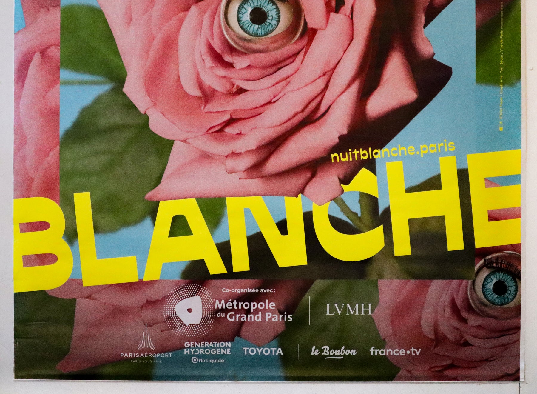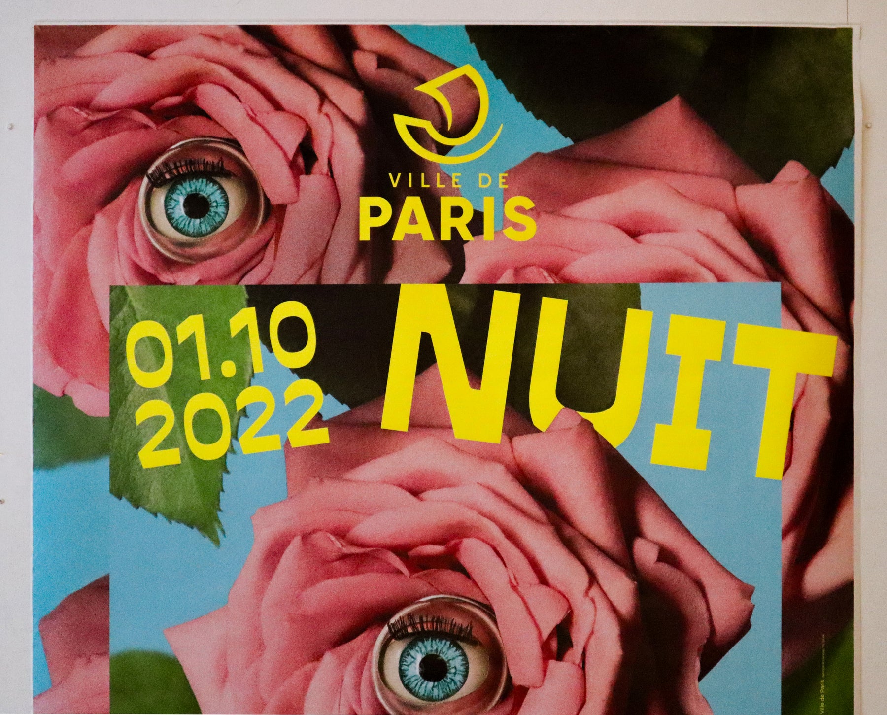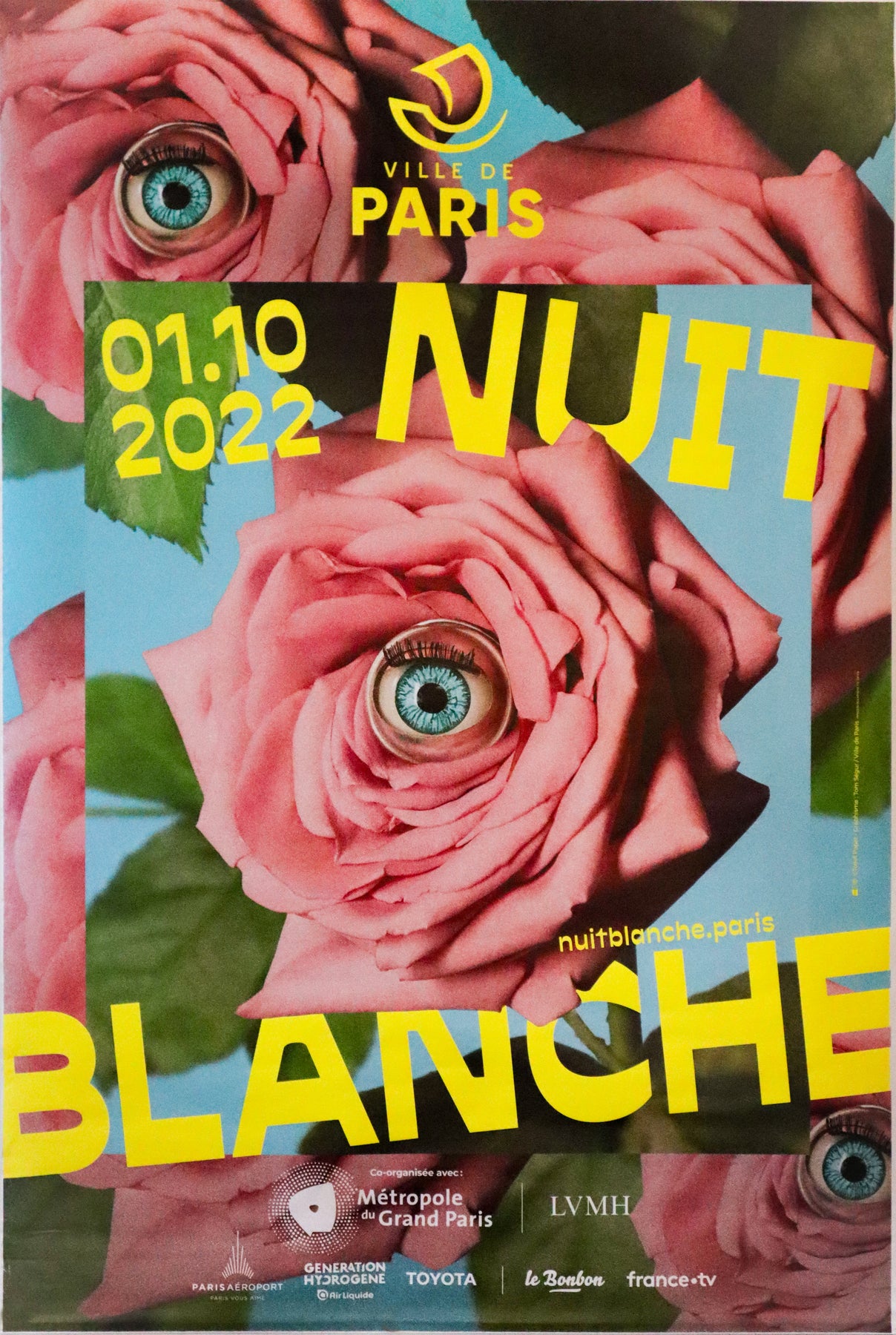 Poster designed by Italian artist Maurizio Cattelan, for Nuit Blanche in Paris 2022. Nuit blanche, a multidisciplinary arts festival, occurs annually in Paris. Maurizio is well known for his work Comedian in 2019, which sold for 6.4 million at auction. The design includes roses, with doll's eyes.