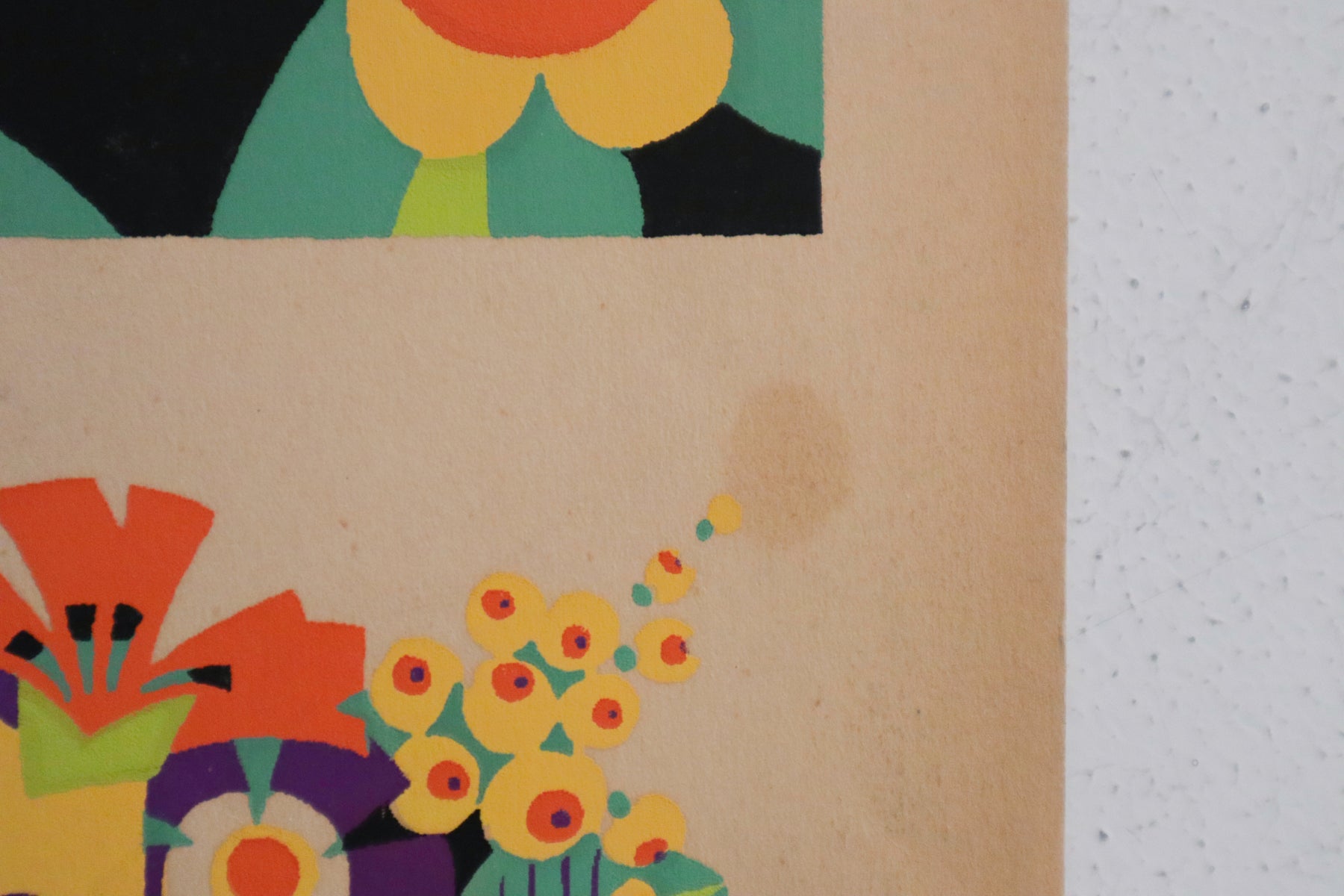 The pochoir has small rips on the bottom right and top left, as well as discoloring and fraying along the edges. Please see photos.