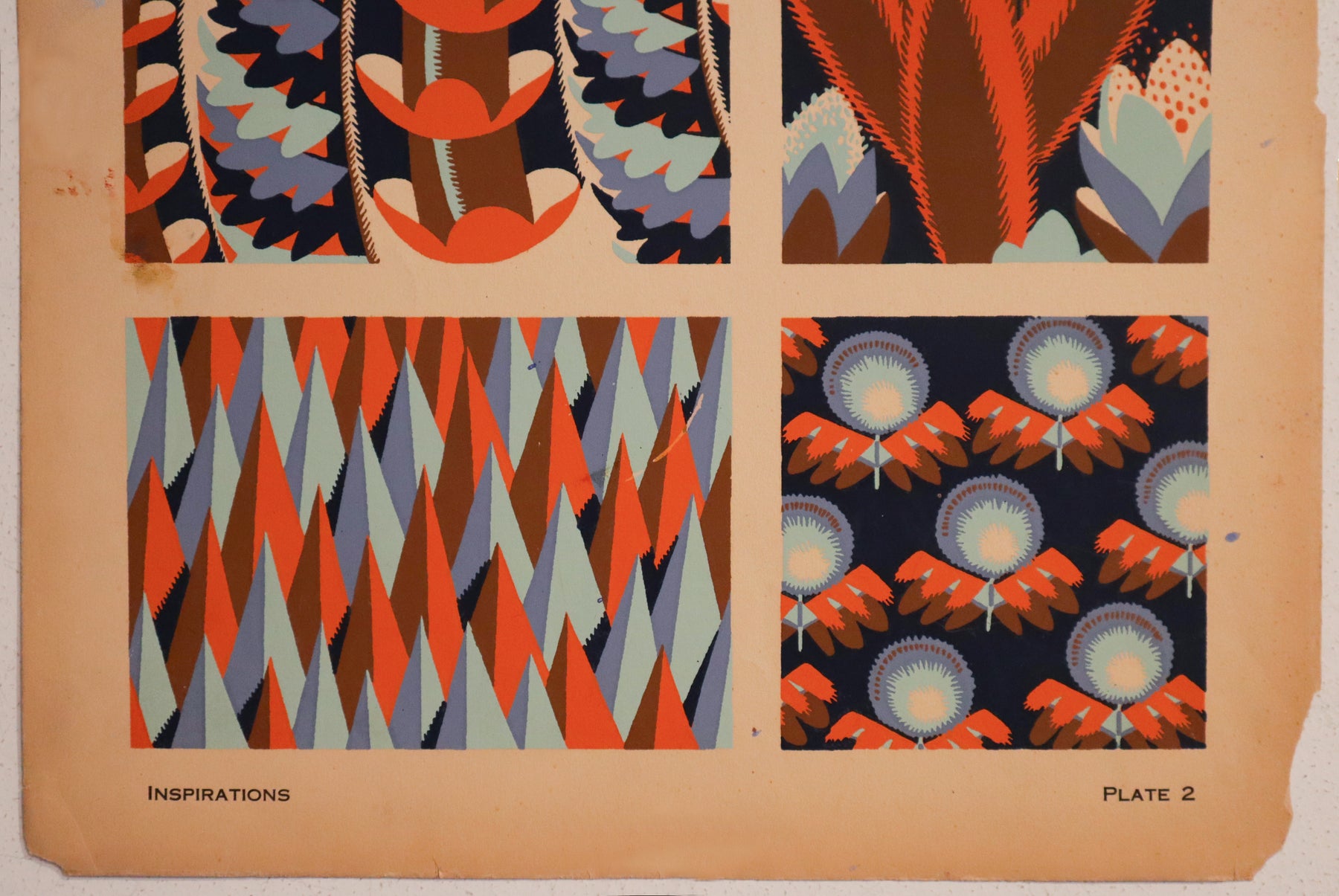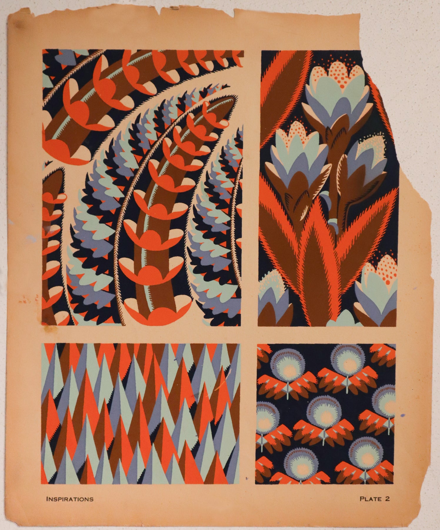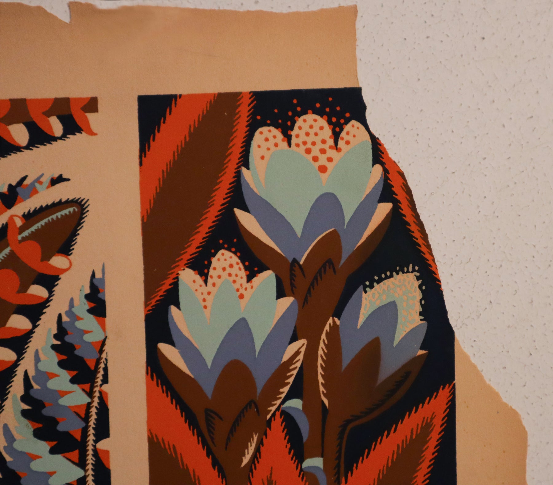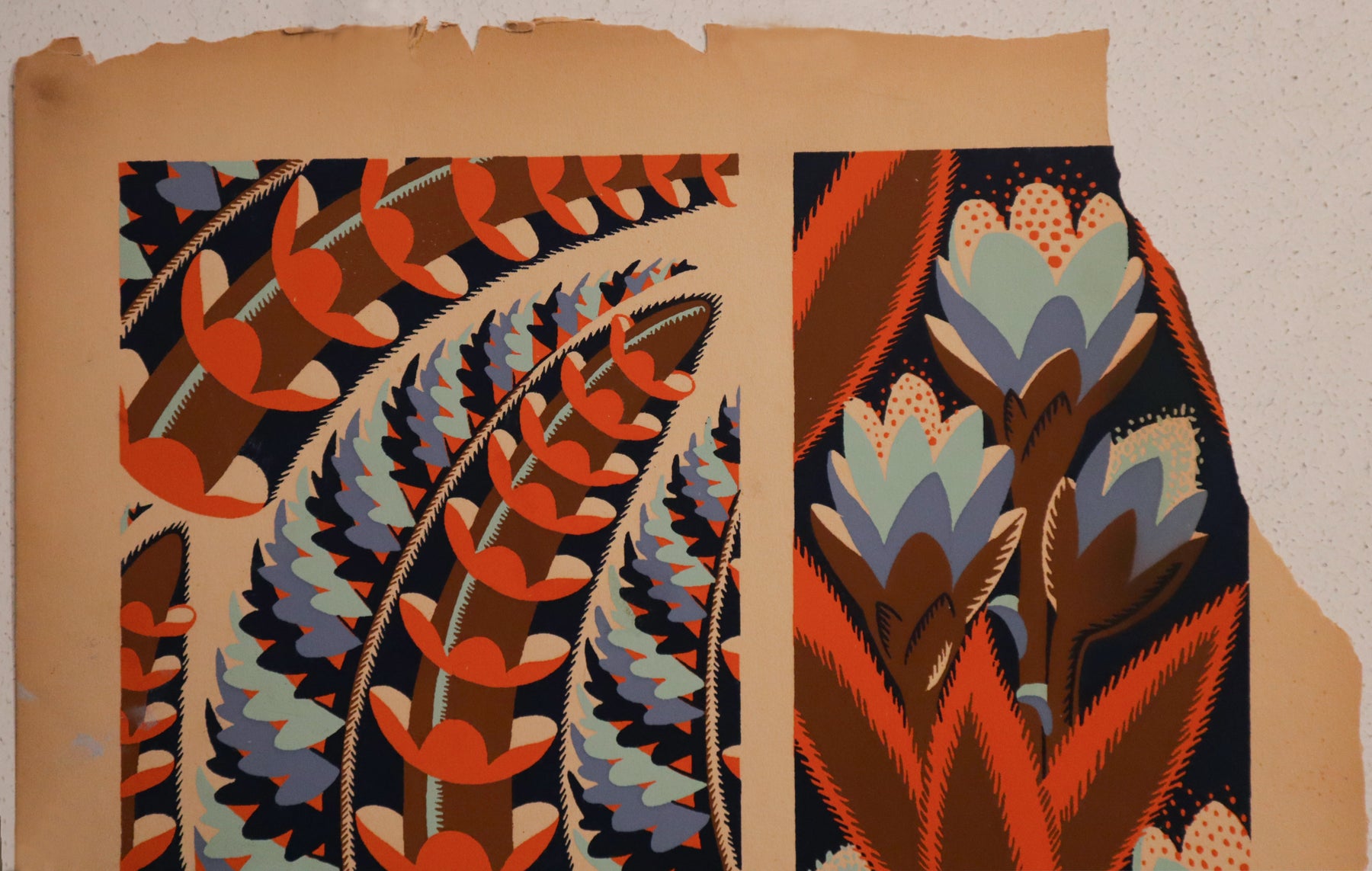 This pochoir (a French variation of a hand-coloured stencil) would have been used by designers to show clients and collectors patterns for wall-paper, fabric or tapestries. Its excellent colour and fabulous detail make it a unique vintage piece, perfect for any design lover.