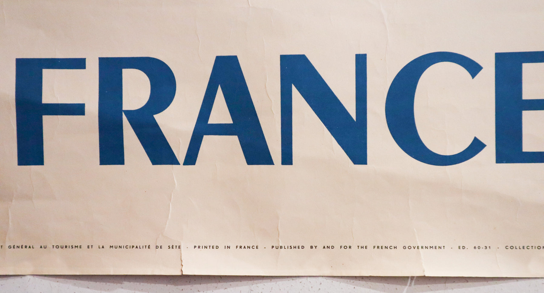 About The Poster: A fabulous travel poster advertising travel to France, and highlighting some of the regions - Languedoc, the Mediterranean and Sete - for which the country is best known.
