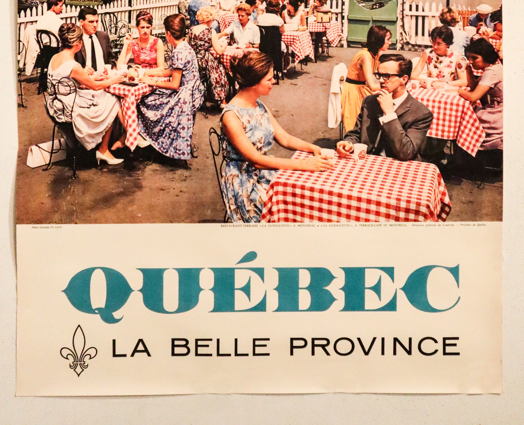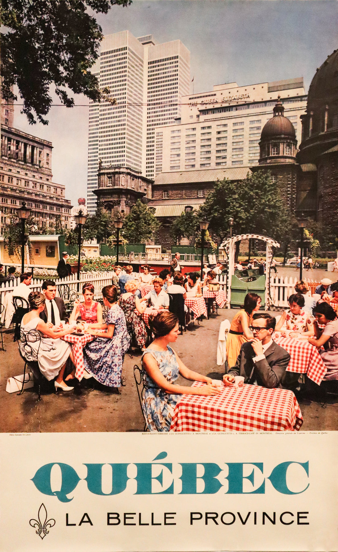 About The Poster: This beautiful poster was produced for the Quebec tourism board in the 1960s and features an open air café (or "la guingette" in french) in the city of Montreal. The text along the bottom reads 'La belle province' - Quebec's nickname. Montreal is the largest city in the province of Quebec and was founded in 1642. The city is on the Saint Lawrence river, traversed by the historic Lachine Canal, and centered around Mount Royal. Home to more than a million people, Montreal is a hub for business and creative industries and known for its rich cultural scene.