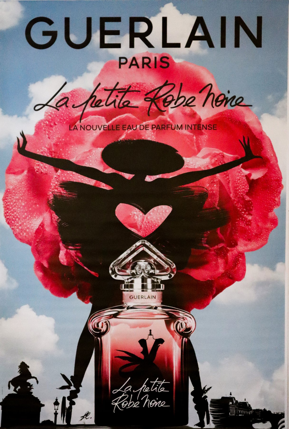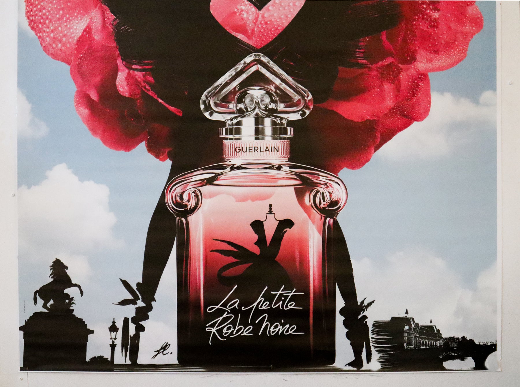 About this poster: French advertisement from Paris for La petite robe noire Perfume by Guerlain. The fragrance is meant to be a versatile and staple scent- much like a little black dress is to a wardrobe. This poster is fit for a large space, and in great condition!