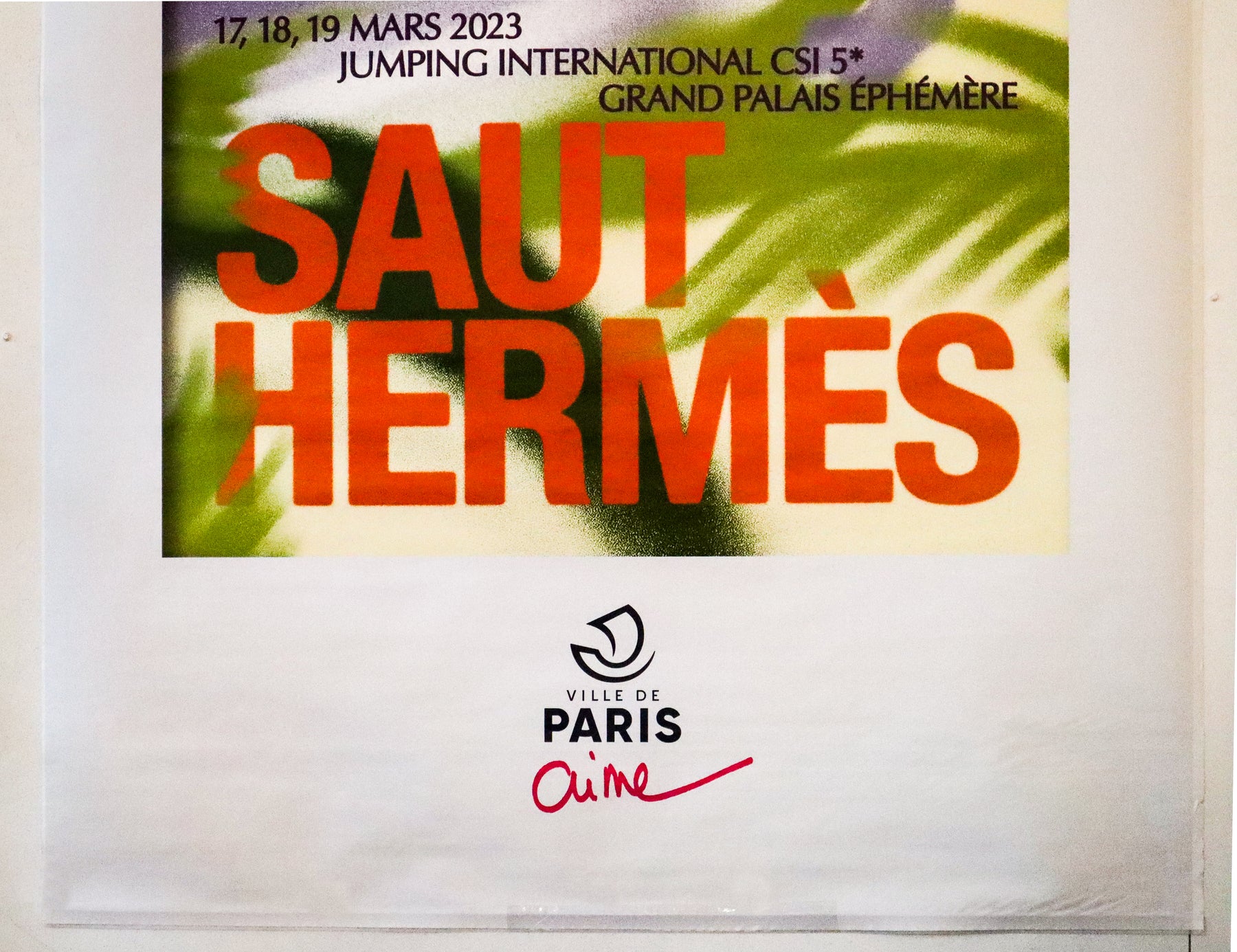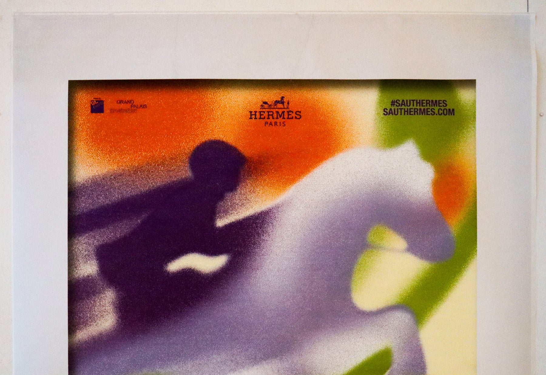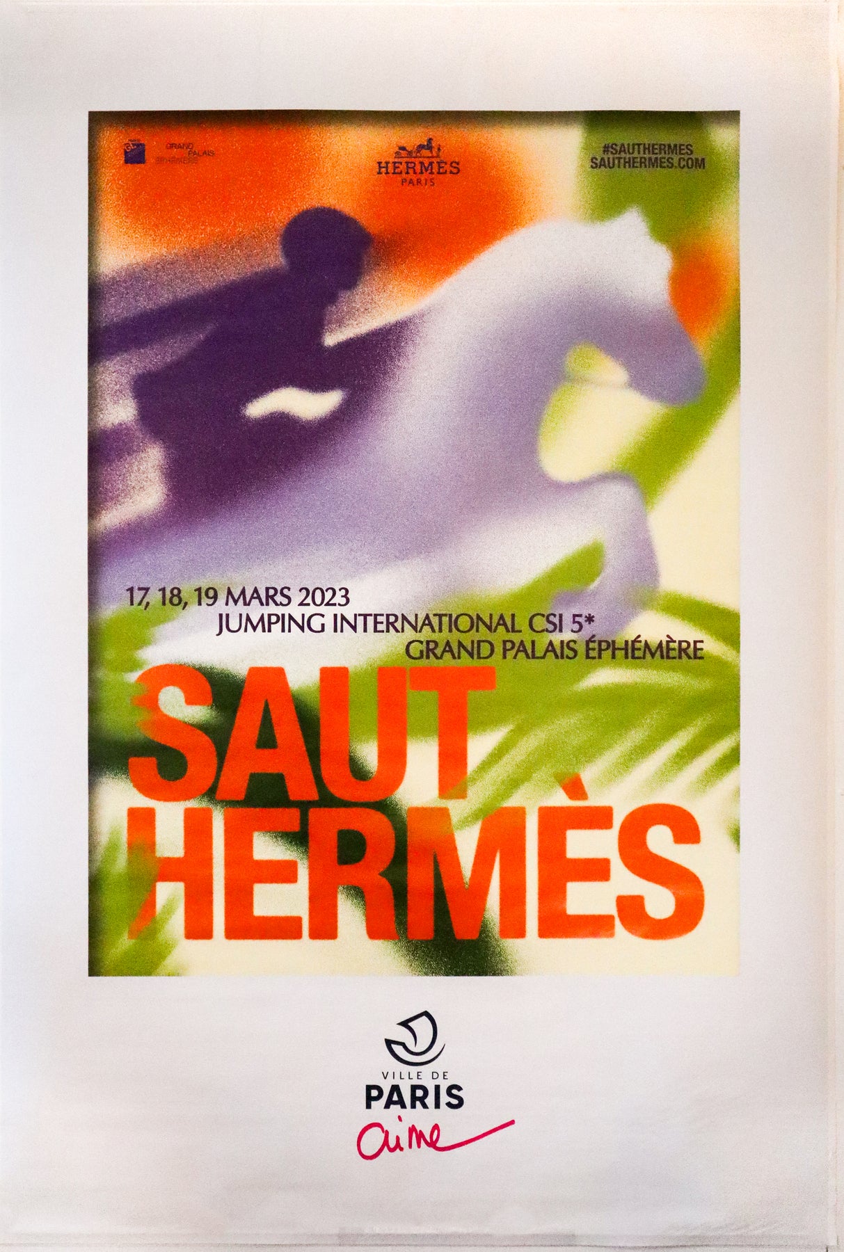 Poster from Paris advertisement in bus shelter for Saut Hermès in 2023. Saut Hermès is an annual international jumping competition which takes place in Grand Palais, Paris. The artwork for this poster was created in collaboration illustrator Alexis Jamet and 34 Studio. This poster is in excellent condition, and perfect for a large space!