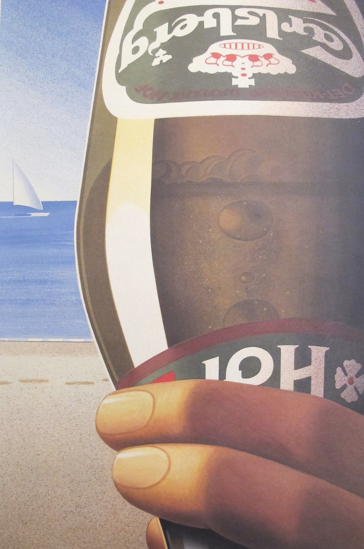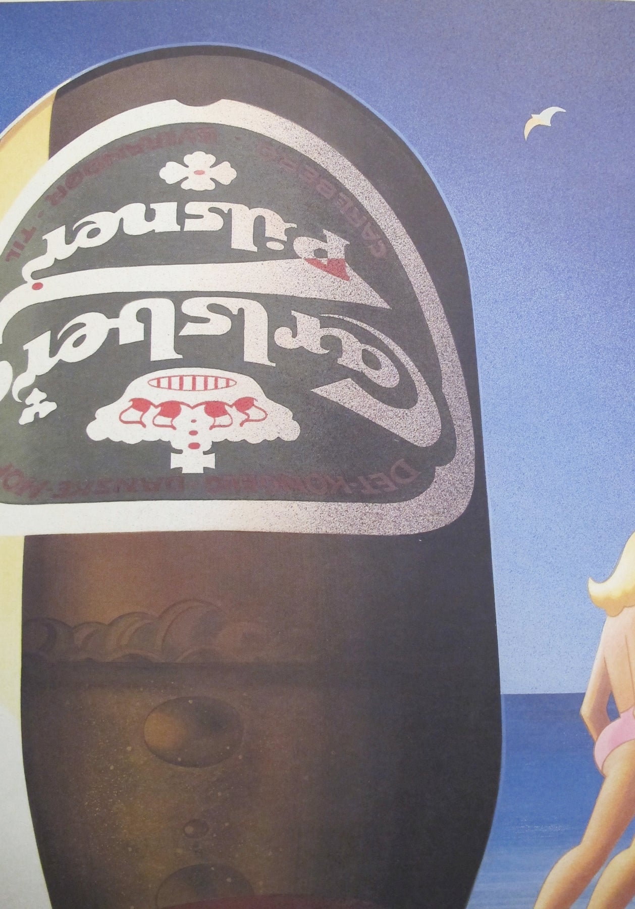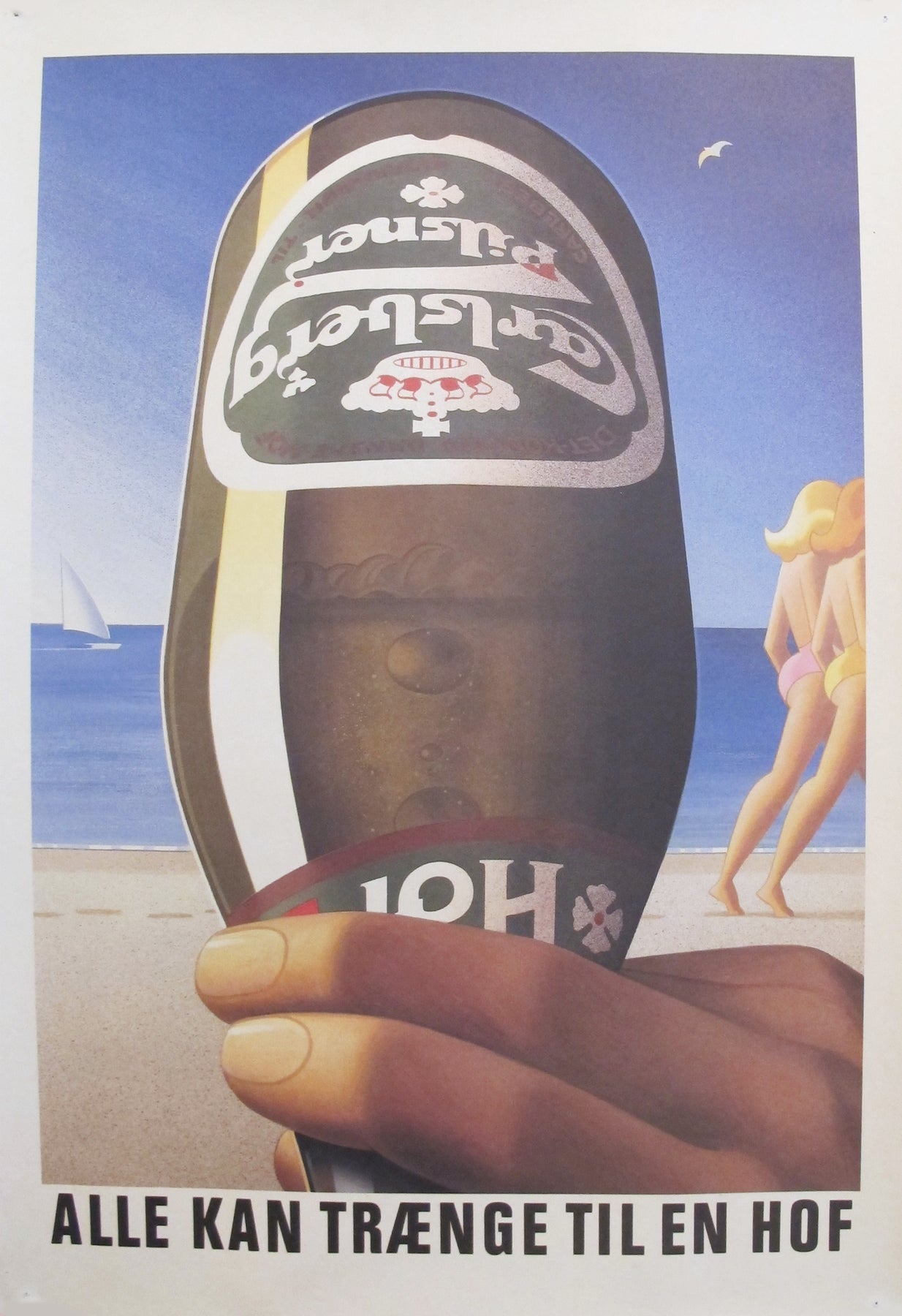 This poster is an advertisement for Carlsberg lager, a Danish beer. The literal translation of the caption "Alle Kan Traenge Til en Hof" is "Everybody can need a beer" - and this series of ads shows a variety of situations and locations where people can enjoy an ice-cold Carlsberg, like at the beach on a hot summer's day.