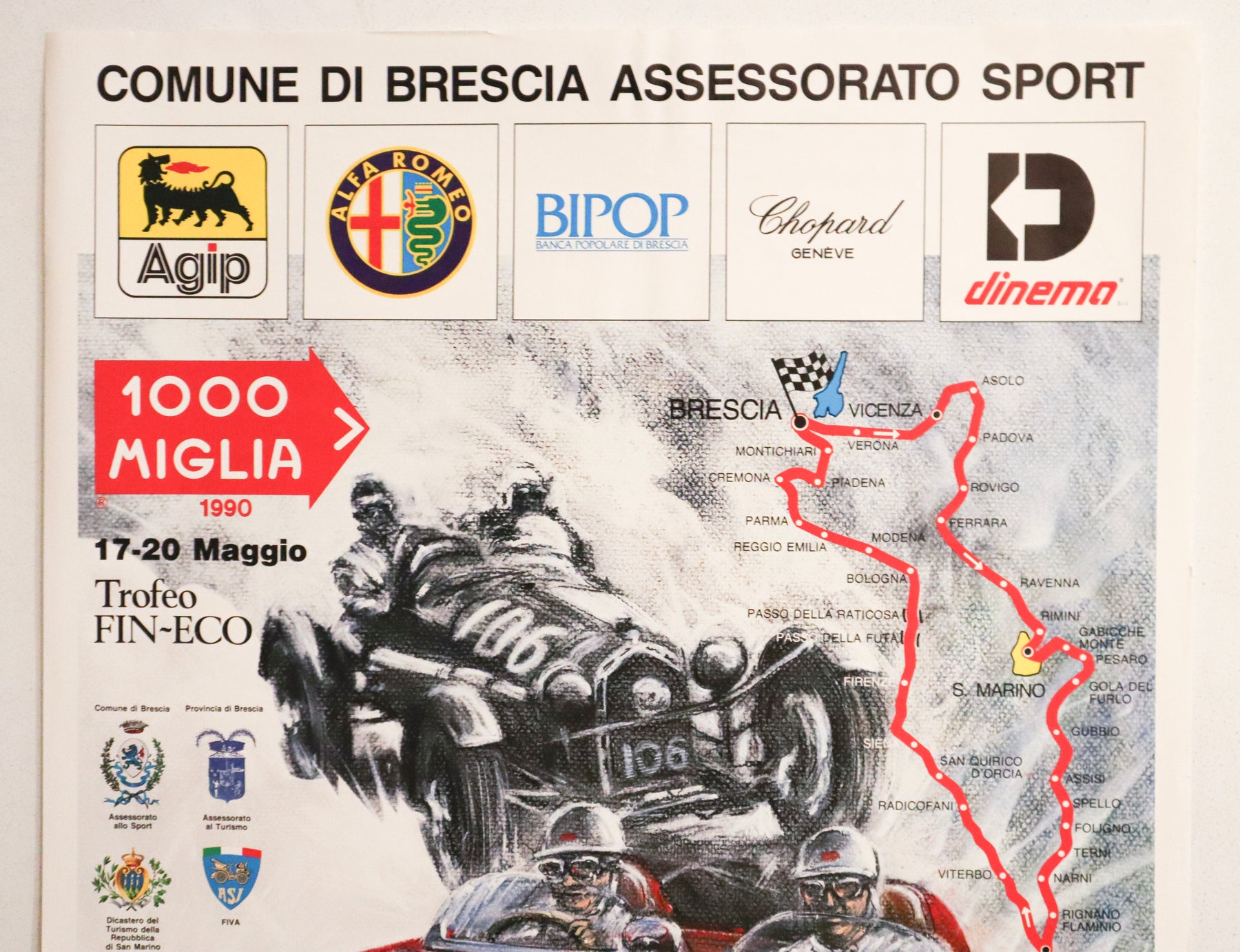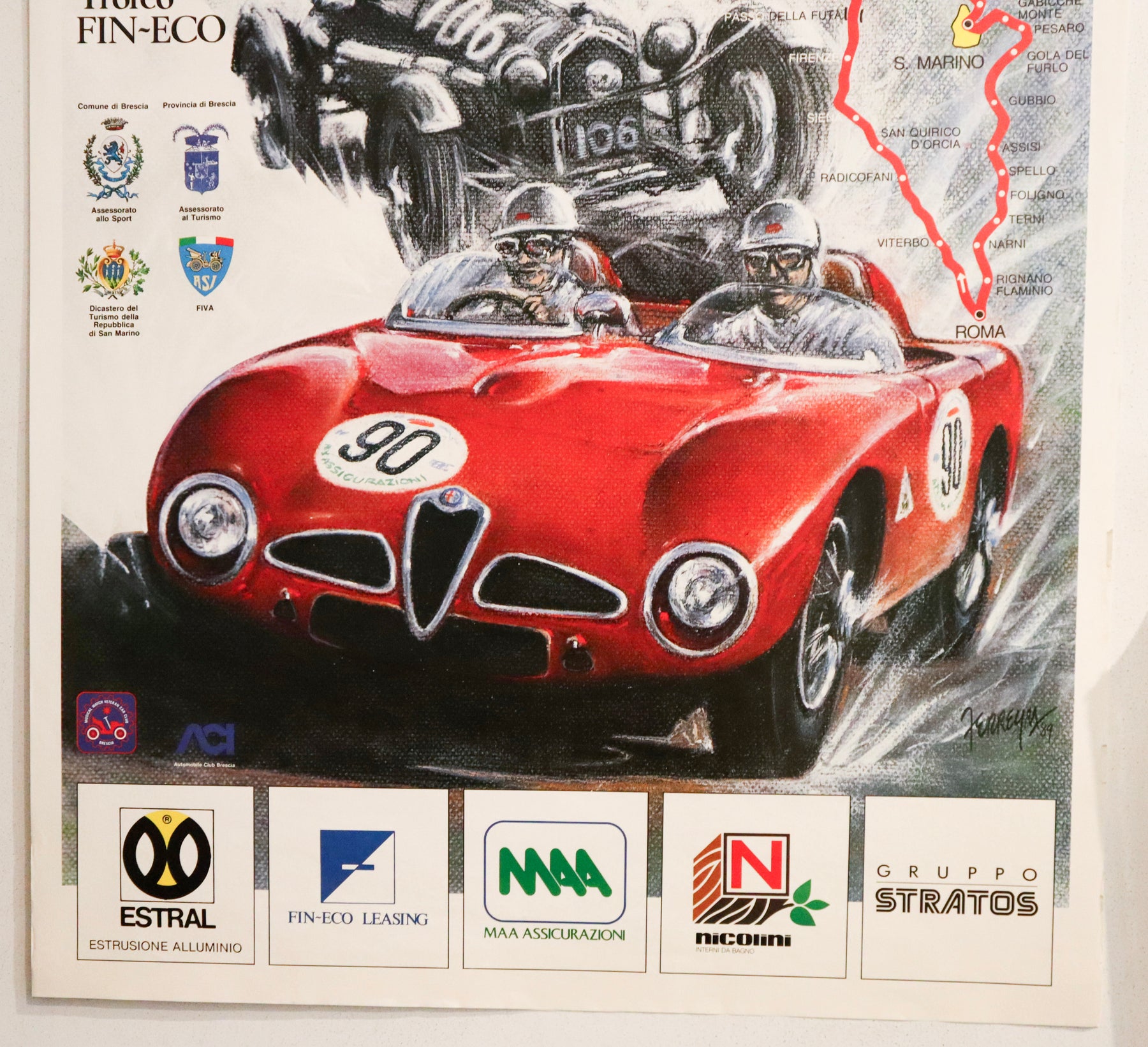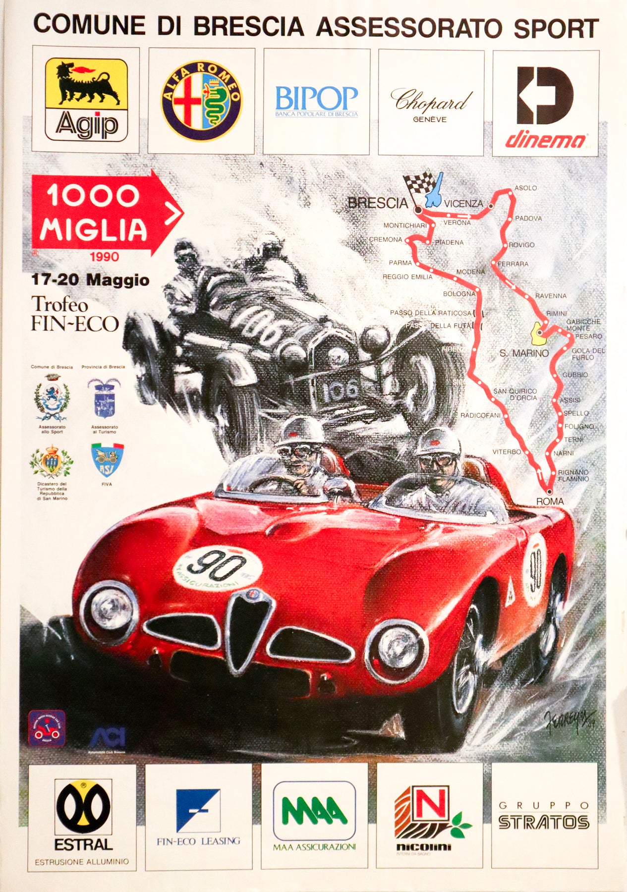 About this poster: Established in 1927 as a speed race by Giovanni Canestrini, Franco Mazzotti, Renzo Castagneto and Aymo Maggi, 1000 Miglia is today a regularity race for historic cars that passes through the unique landscapes of the most beautiful parts of Italy. A journey characterized by the warmth of the public and the enthusiasm of drivers, following the bold and innovative spirit of its tradition. (1000 Miglia)
