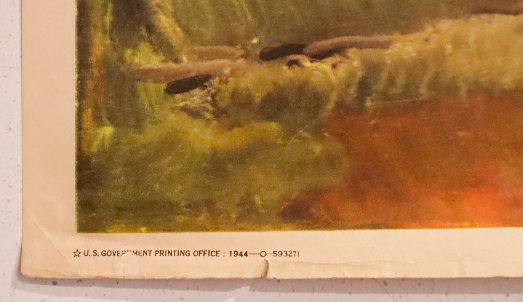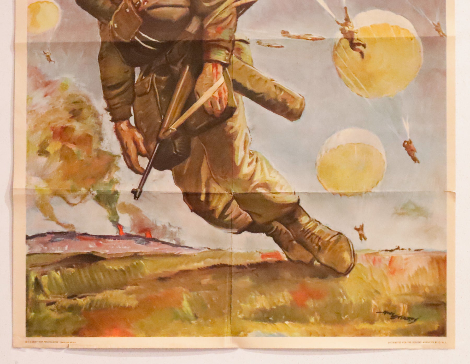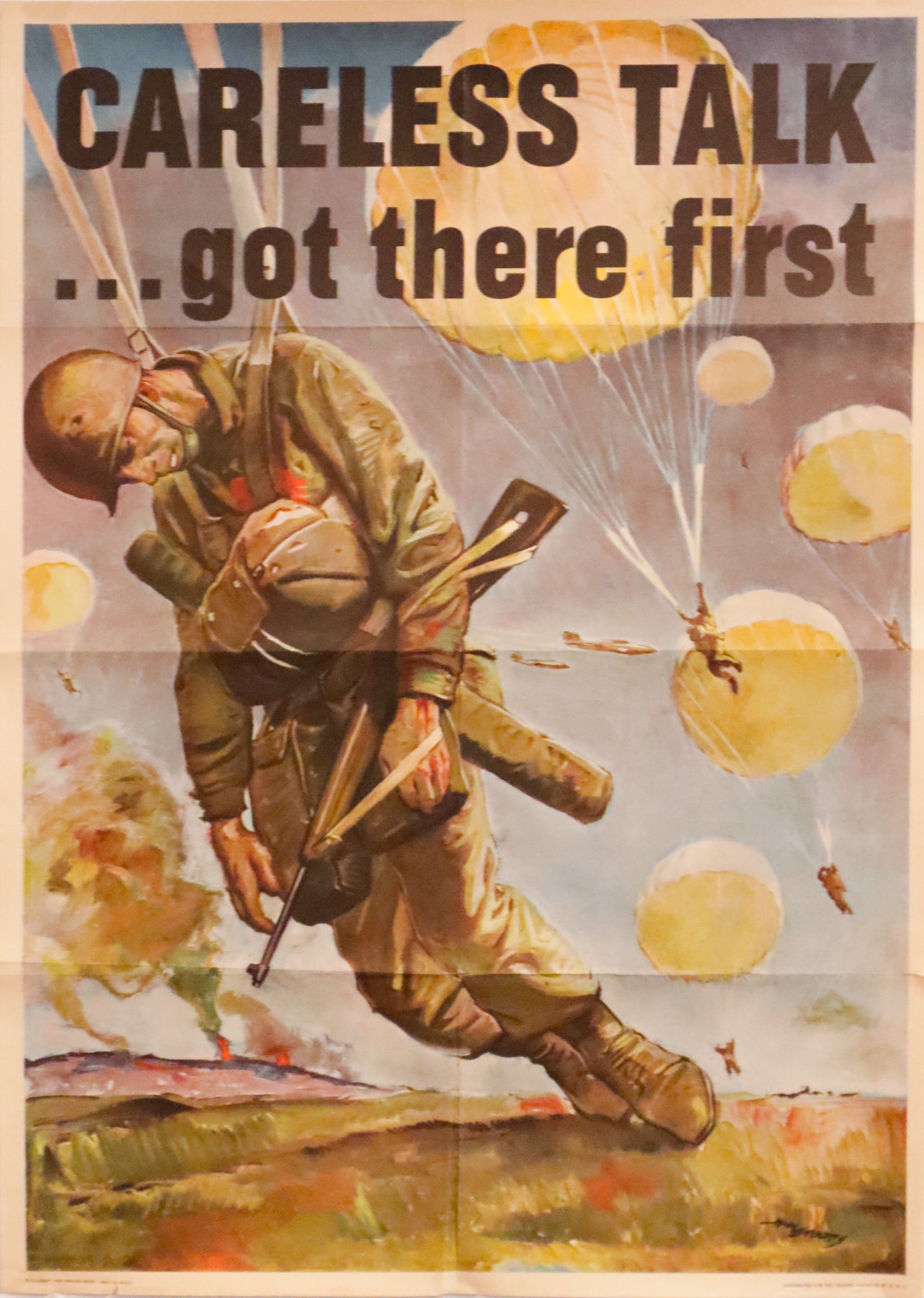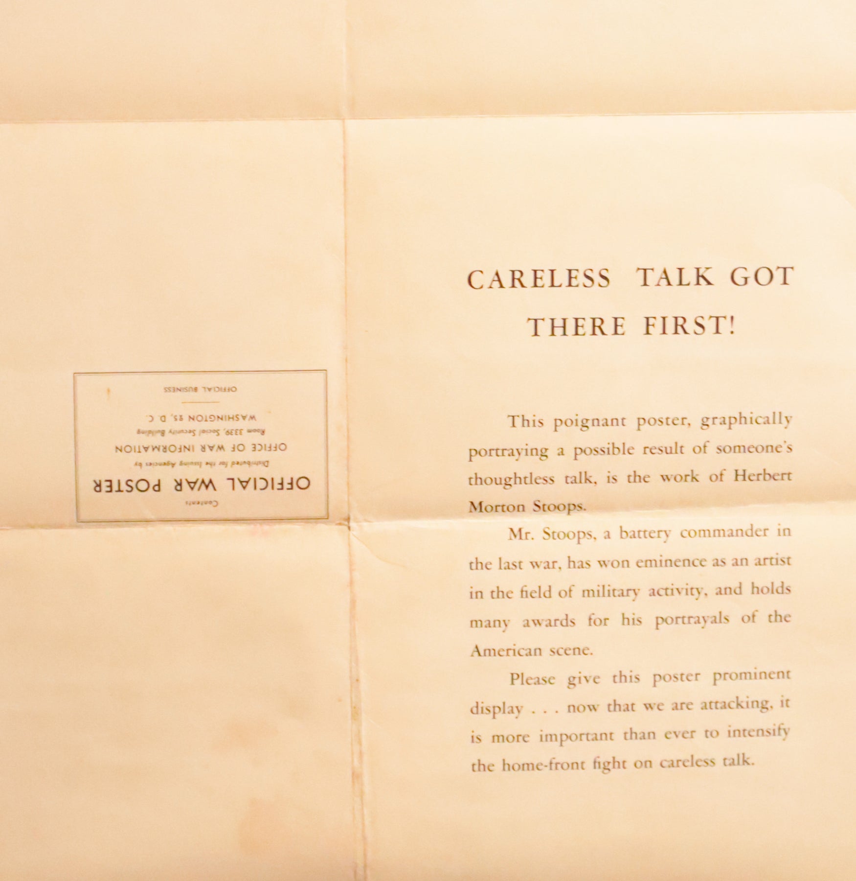 Put out by the Office of War Information, on the reverse it reads "This poignant poster, graphically portraying a possible result of someone's thoughtless talk, is the work of Herbert Morton Stoops. Mr. Stoops, a battery commander in the last war, has won eminence as an artist in the field of military activity, and holds many awards for his portrayals of the American scene. Please give this poster prominent display ... now that we are attacking it is more important than ever to intensify the home-front fight on careless talk."