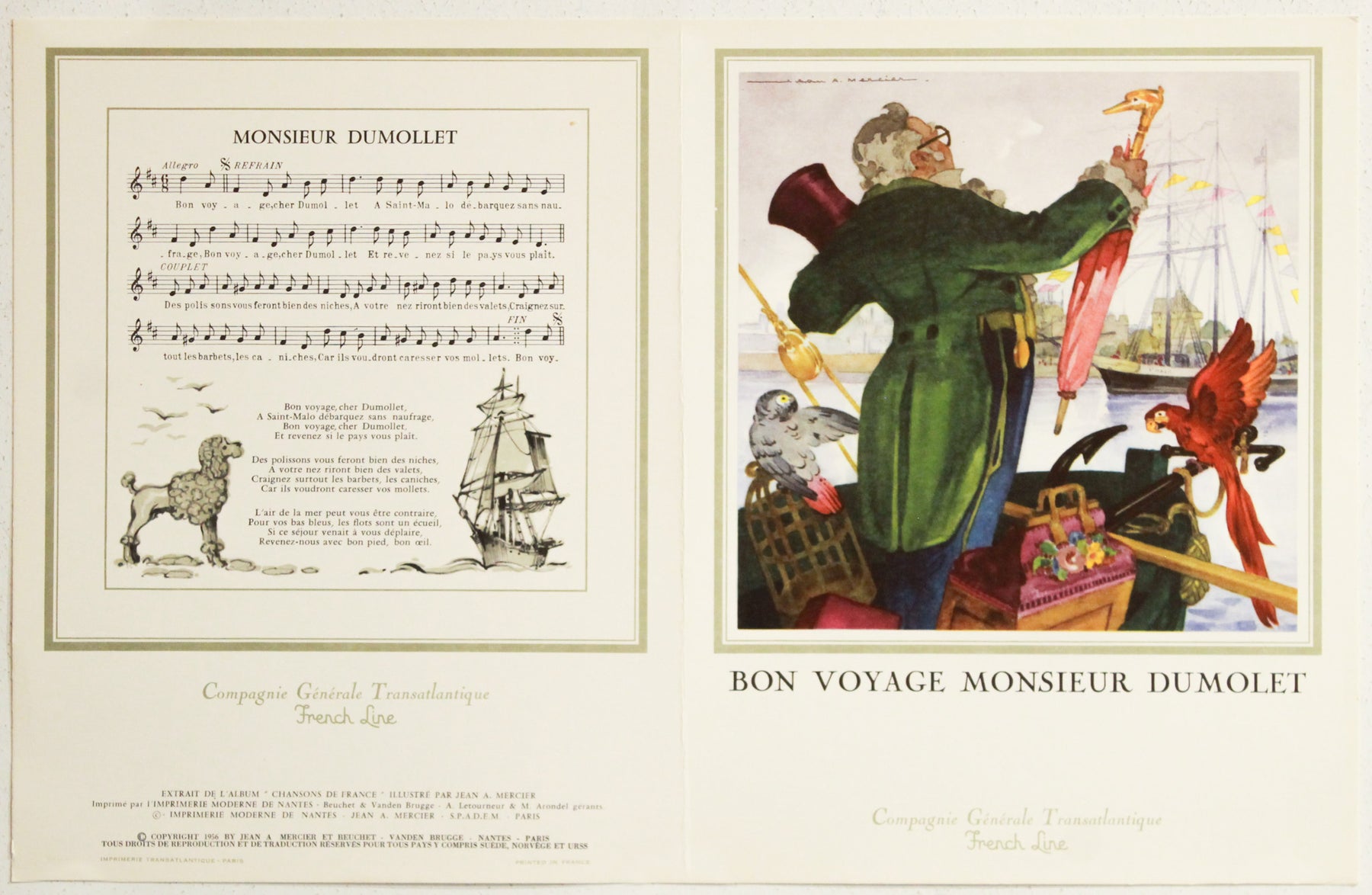 1956 French Music Sheet, " Bon Voyage Monsieur Dumolet ", Extrait de l'album "Chansons de France" - Jean A. Mercier