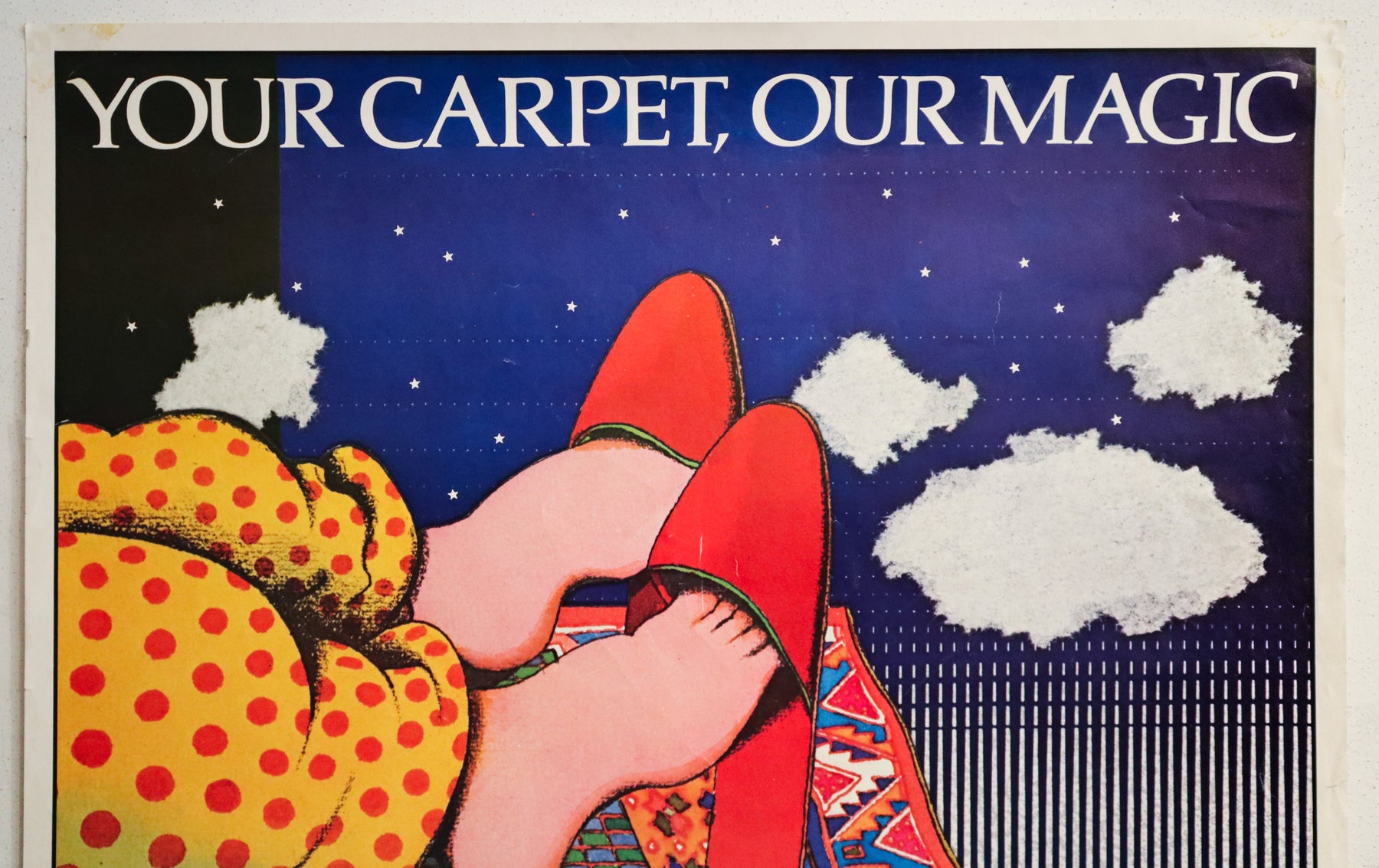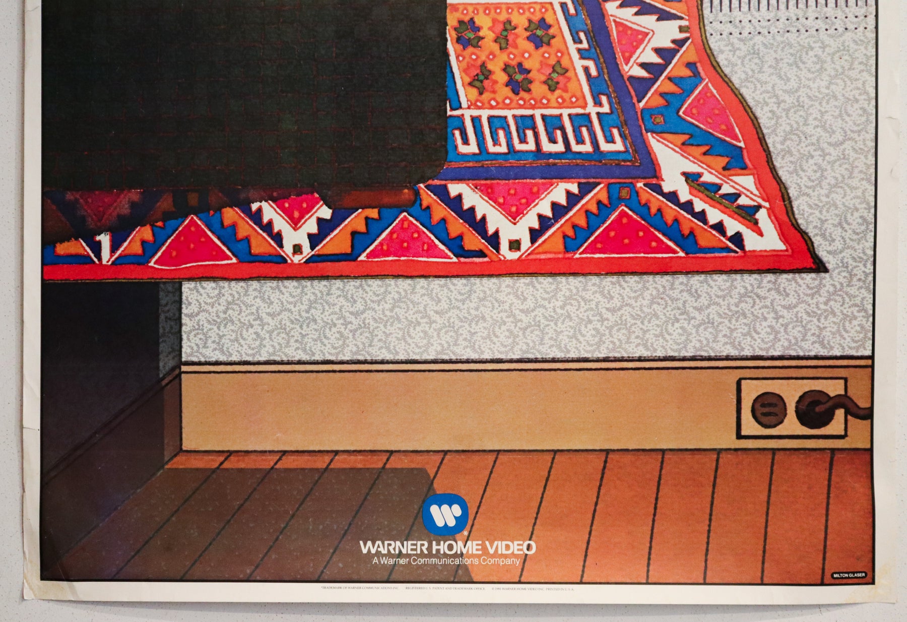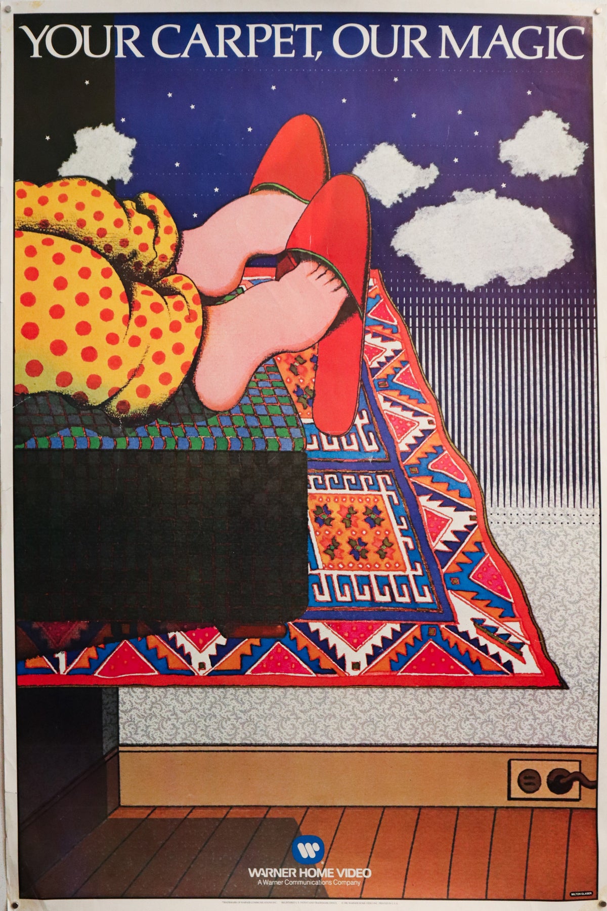 About the poster: Promotional poster issued by Warner Home Video featuring a whimsical design of a magic carpet ride, playfully connecting the comfort of home with the escapism of cinema. The bold slogan, “Your Carpet, Our Magic”, captures the era’s creative approach to marketing home video entertainment. A vibrant and imaginative piece that reflects the cultural optimism of early VHS advertising.