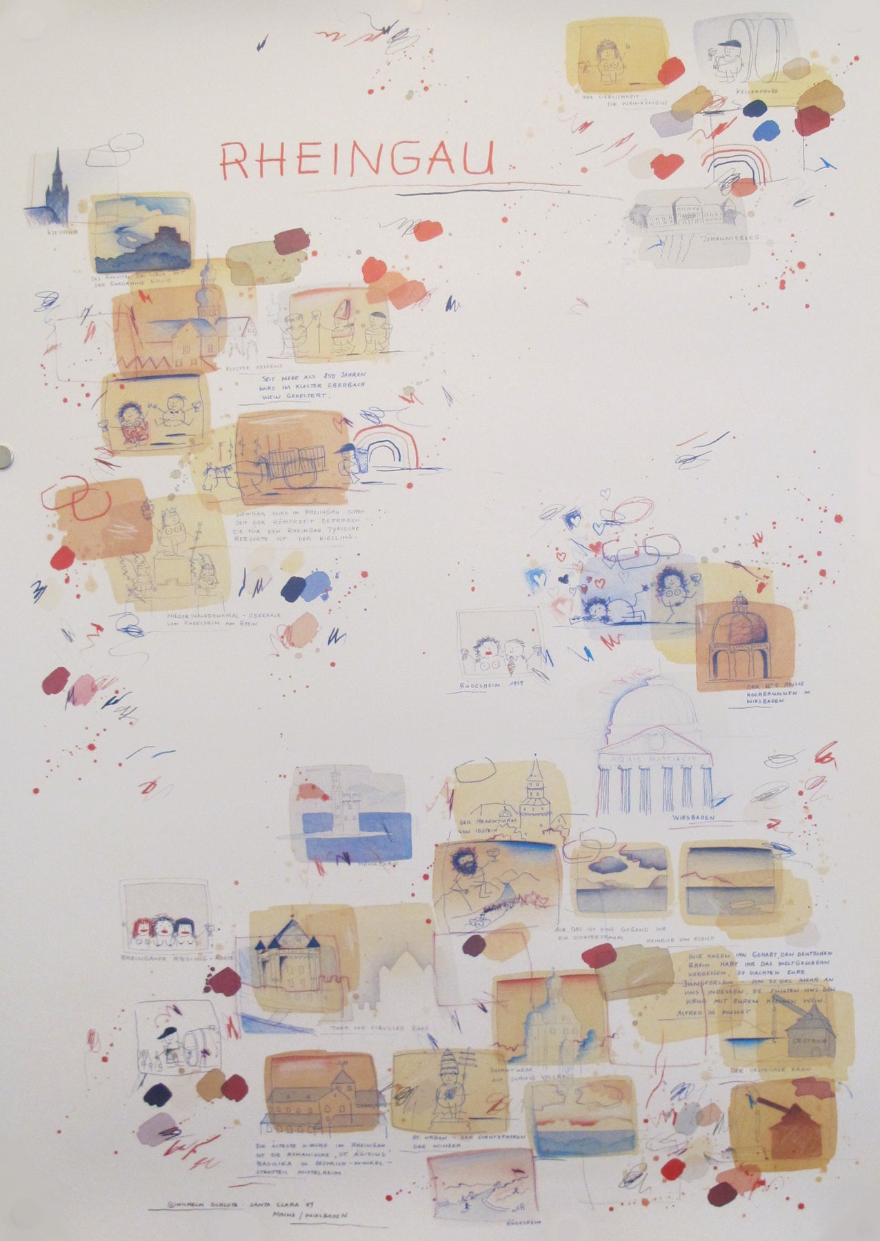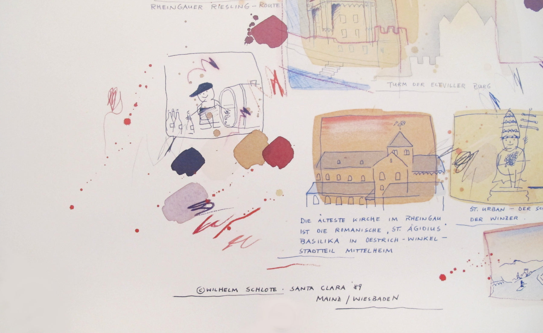 This poster, in particular, was created for the Rheingau district. Translated as "Rhine District", it is located on the Northern side of the Rhine between the German towns of Wiesbaden and Lorch near Frankfurt. It is famous for Rheingau wines, especially the "Rheingauer Riesling," and its many taverns.
