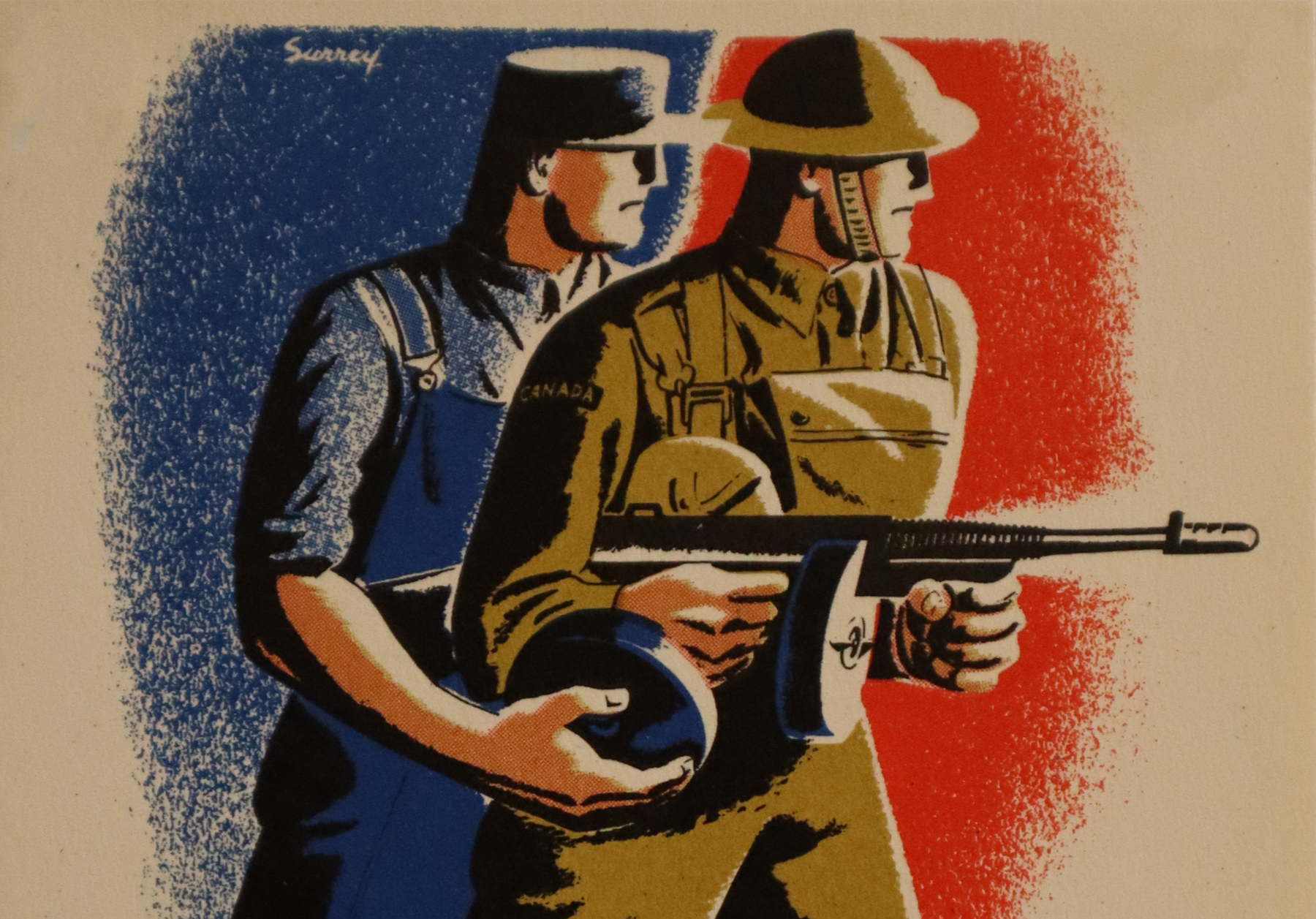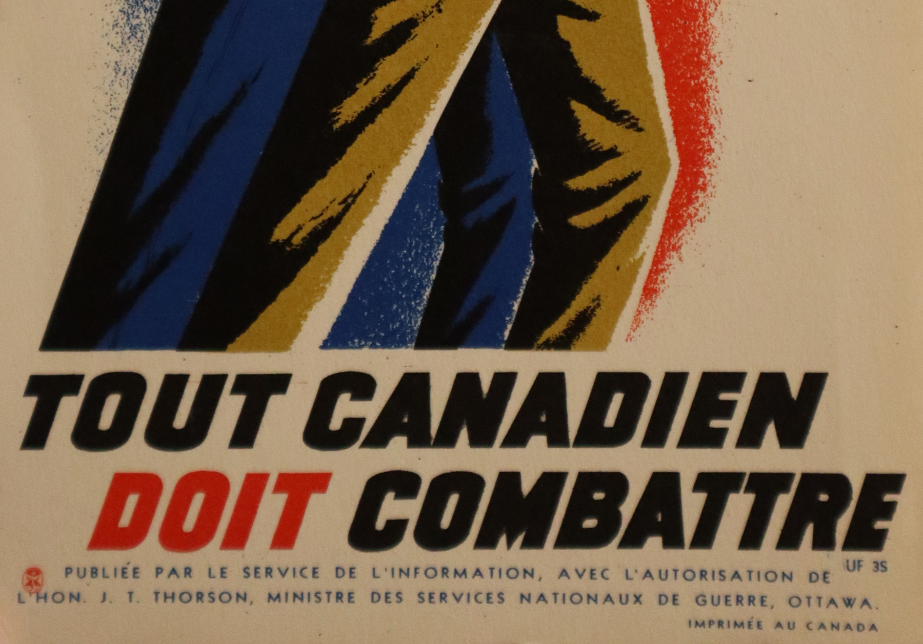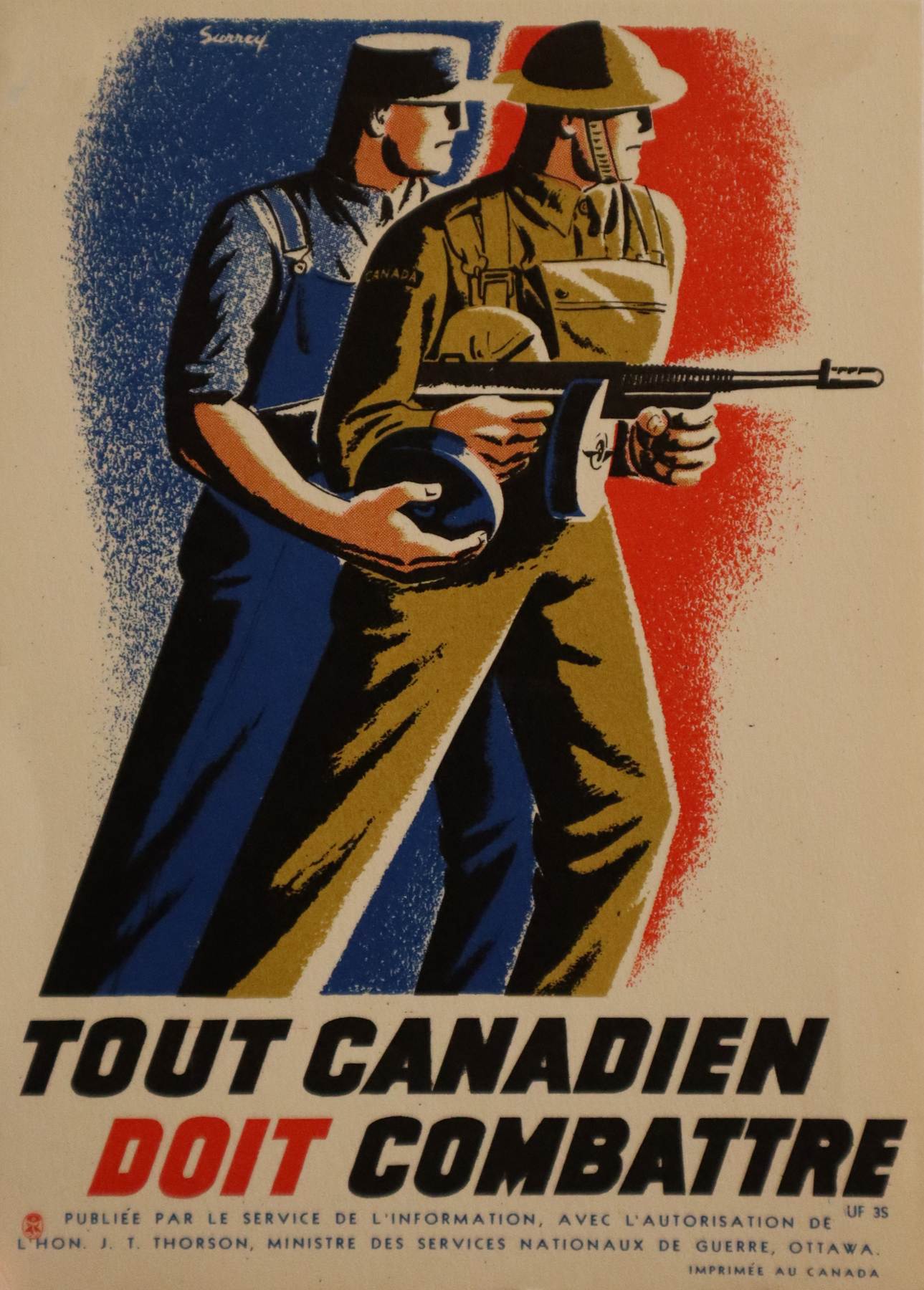 About the poster: This is a vintage-style propaganda poster illustrated by artist Philip Surrey, featuring two World War II soldiers and the slogan "TOUT CANADIEN DOIT COMBATTRE," meaning "Every Canadian must fight." The message, written in French, was specifically directed at French Canadians, who enlisted in lower numbers compared to English Canadians. Surrey encouraged a greater urgency toward participation in the war effort.