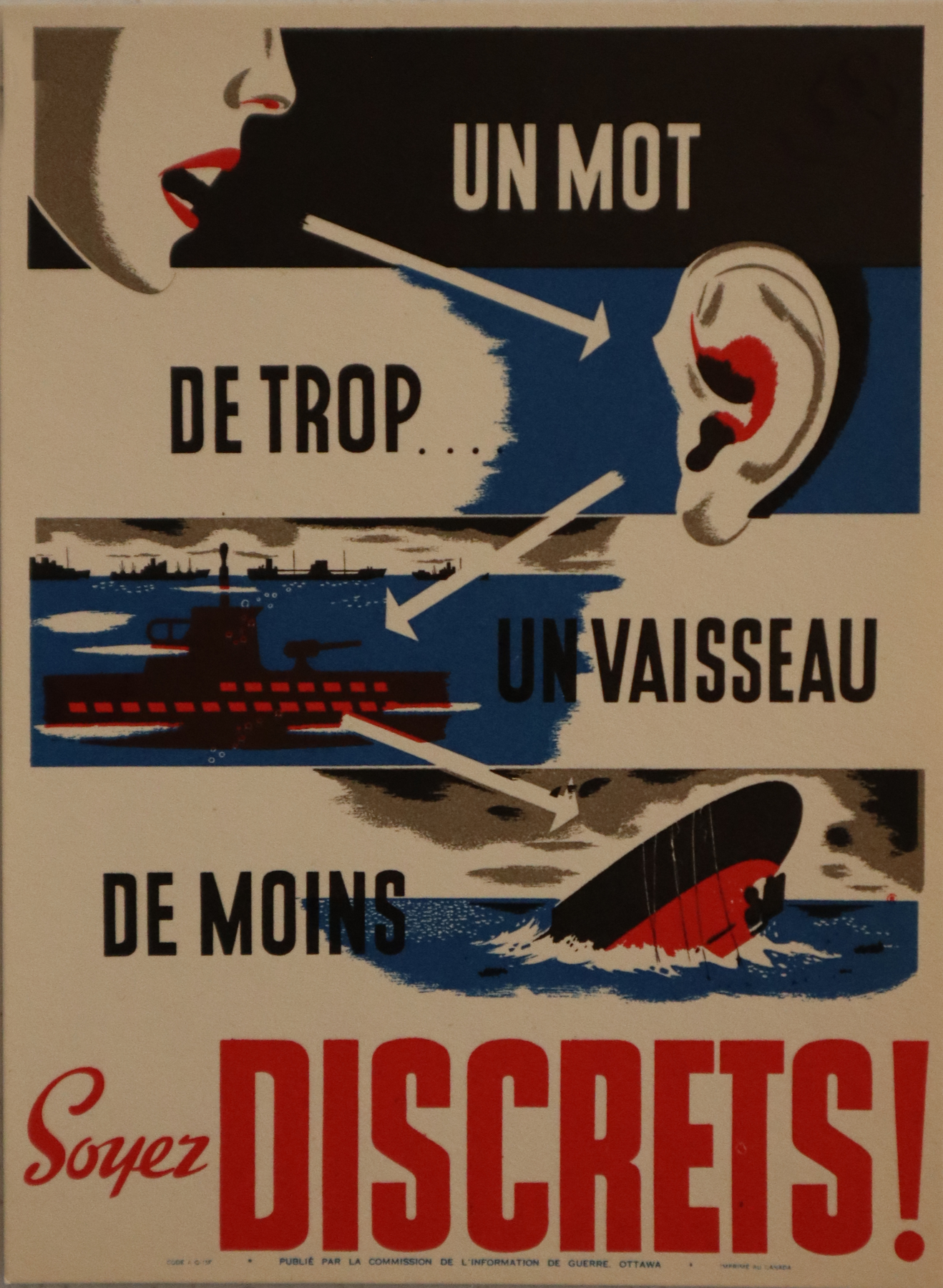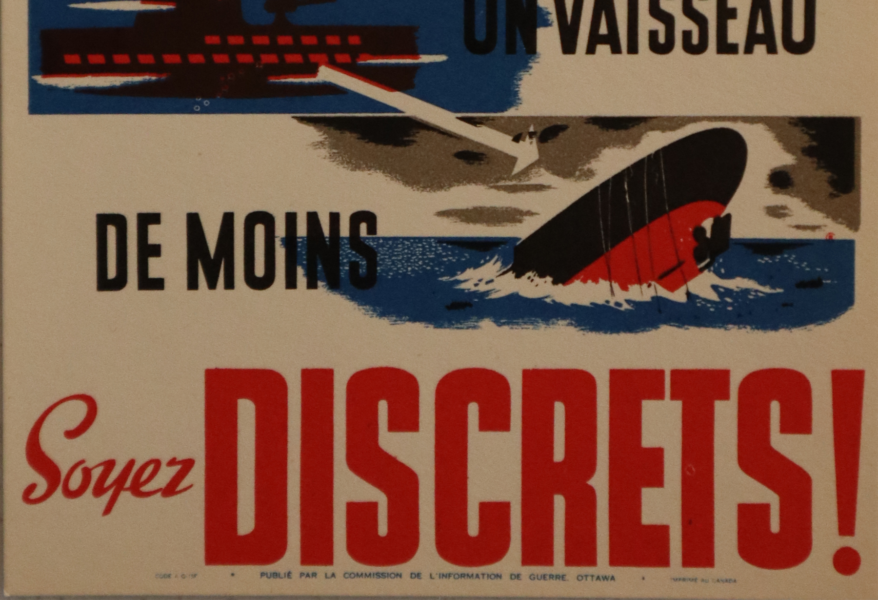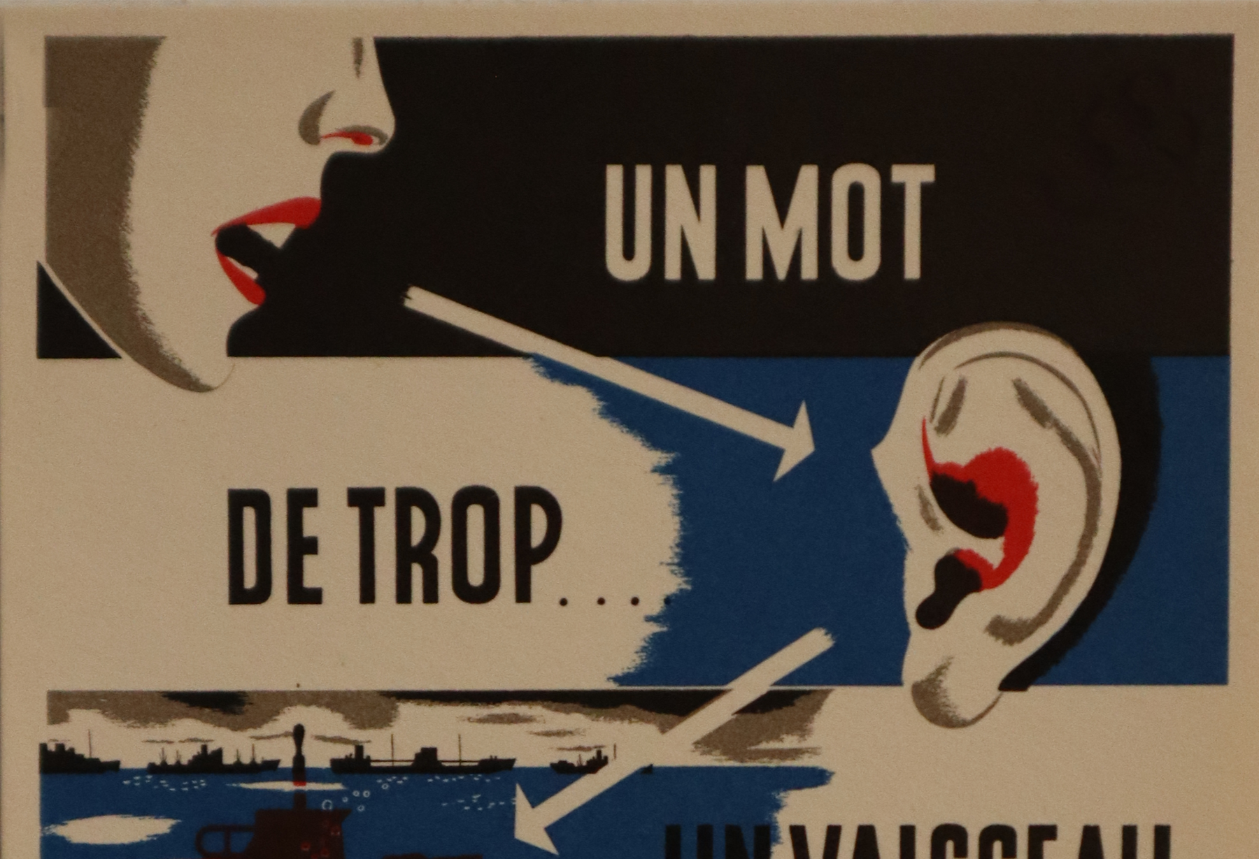 About the poster: This is a vintage-style propaganda poster featuring the slogan "Un Mot De Trop... Un Vaisseau De Moins, Soyez Discrets!," meaning "One word too many... One ship less. Be discreet!" The message warns people to be cautious about what they say, as even a small comment could unintentionally aid the enemy.