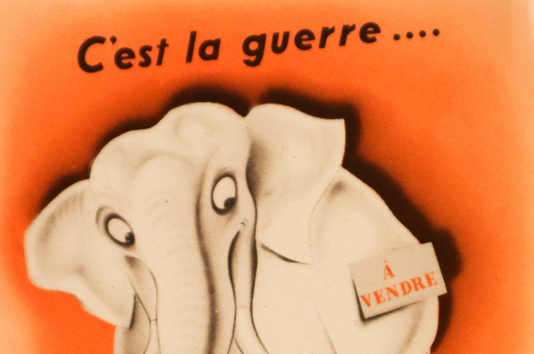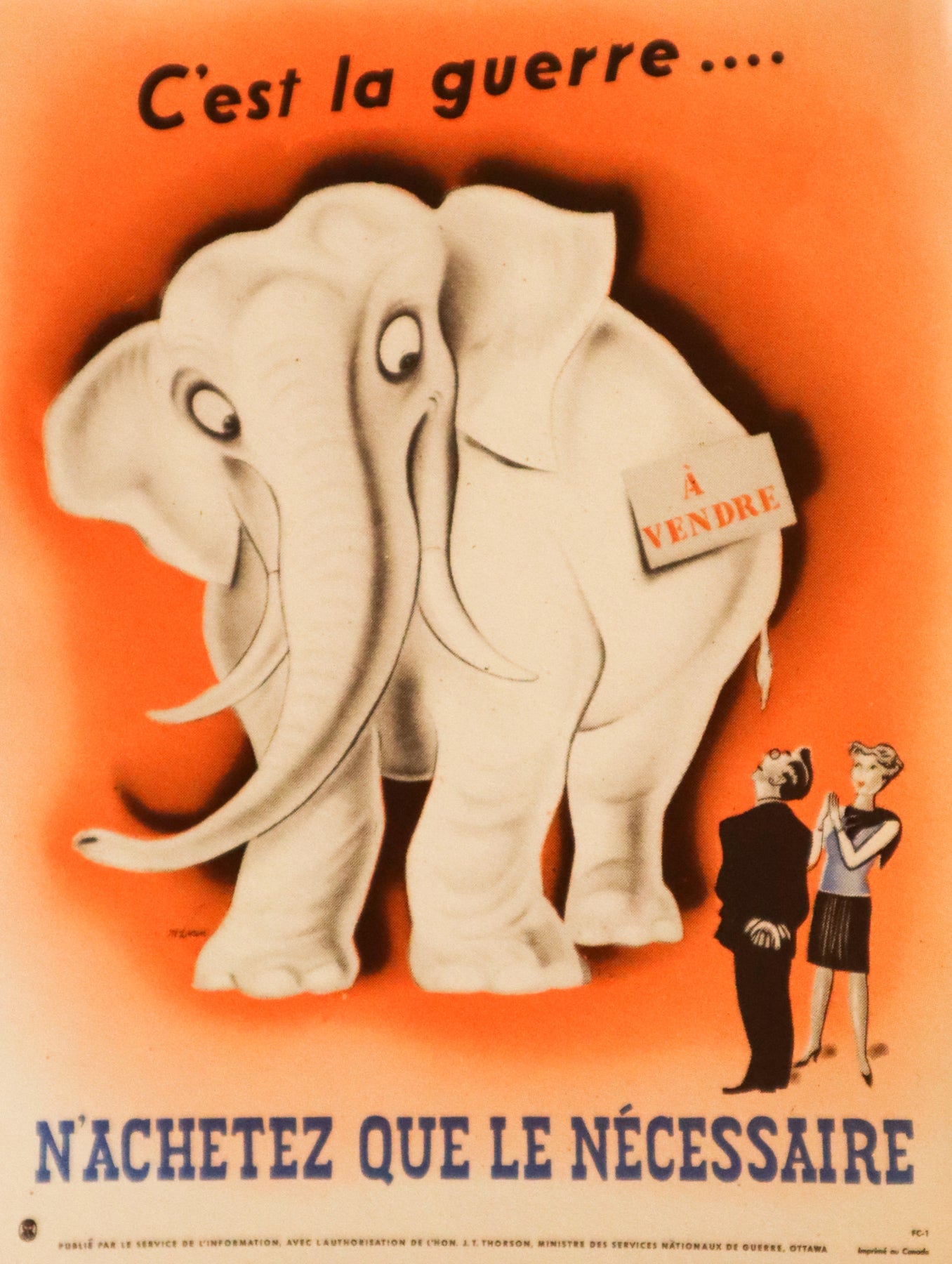 About the poster: Original Canadian World War II propaganda poster urging citizens to avoid frivolous purchases and practice restraint during wartime. Featuring a white elephant marked À vendre, the design highlights the dangers of unnecessary spending. Published by the Wartime Information Board, Ottawa, c. 1940s.