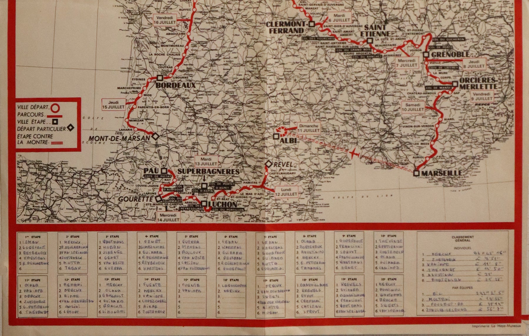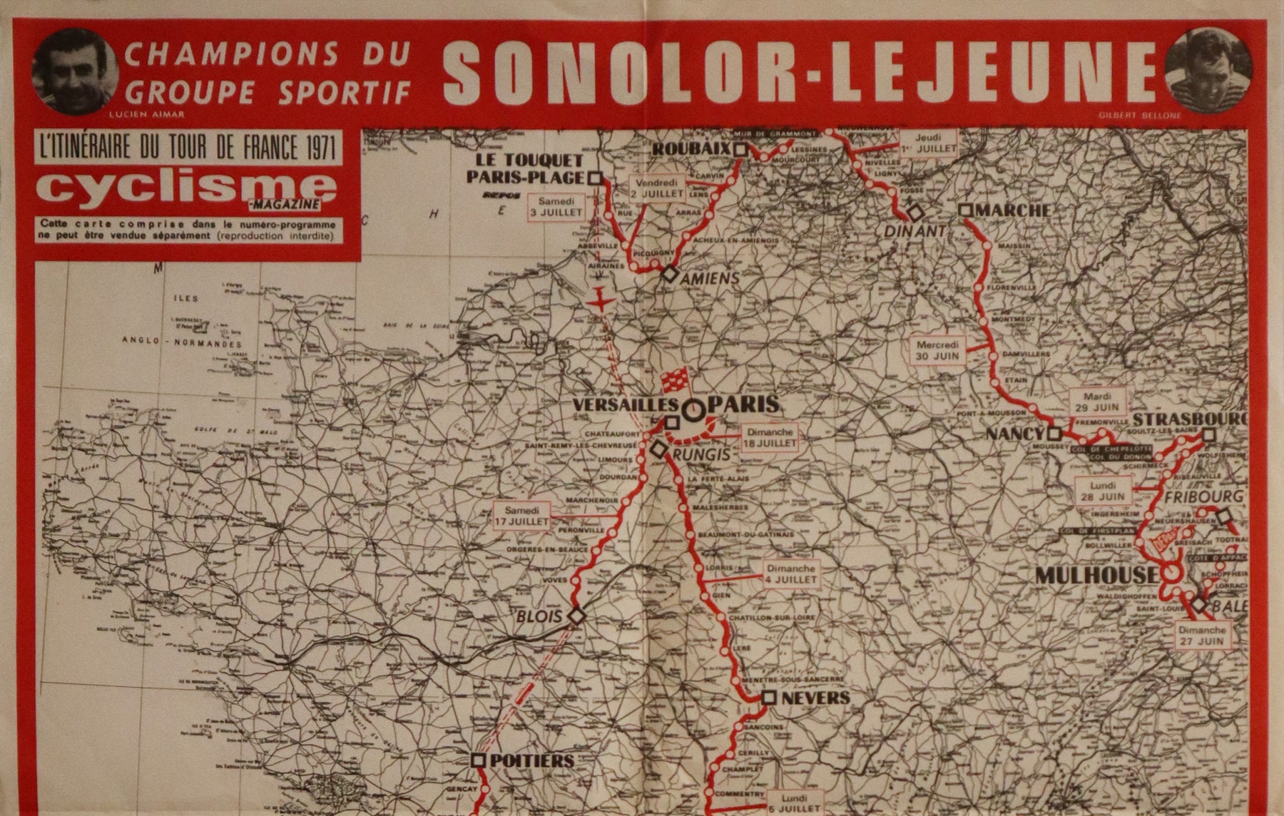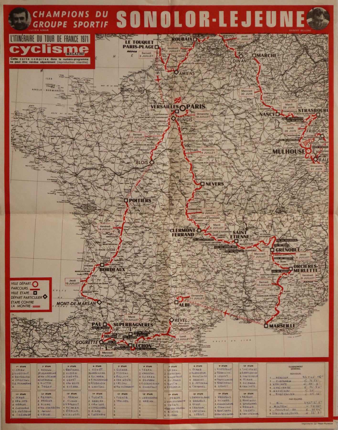 "Le Tour de France [...] est une compétition cycliste qui a lieu principalement en France chaque année, tout en traversant occasionnellement les pays voisins. La course fut organisée pour la première fois en 1903 [...] pour augmenter les ventes du journal L'Auto. [...] La course a lieu chaque année depuis sa première édition en 1903, excepté lors des deux guerres mondiales.Traditionnellement, la course se déroule principalement au mois de juillet. Bien que le parcours change chaque année, le format de la course reste le même avec au moins un contre-la-montre, le passage à travers les chaînes de montagnes des Pyrénées et des Alpes et l'arrivée sur les Champs-Élysées à Paris. Les éditions modernes du Tour de France se composent de 21 étapes réparties sur une période de 23 jours et couvrent près de 3 500 kilomètres. Le tracé du parcours alterne entre le sens horaire et antihoraire de la France." (Wikipédia)
